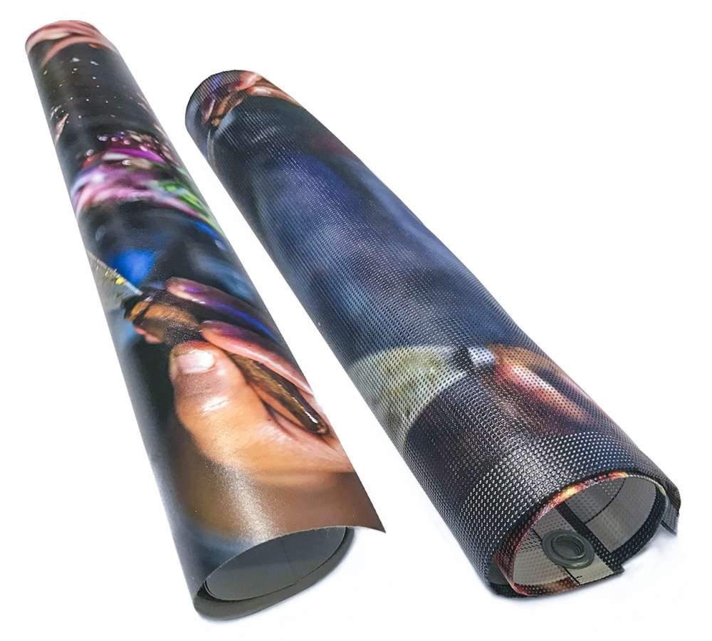 Mesh: Brandklassad hålad banderoll. Lämplig för utomhusbruk med höga krav på UV-beständighet. De små hålen i materialet gör att vind kan passera igenom. Tre års garanti på färgen.