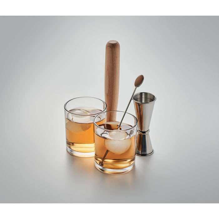 Cocktailglas. Innehåller 7 delar: två muggar, dubbelsidig jiggare i rostfritt stål (25 och 50 ml), träblandare, drinkomrörare i rostfritt stål och två sfäriska isformar i silikon.
