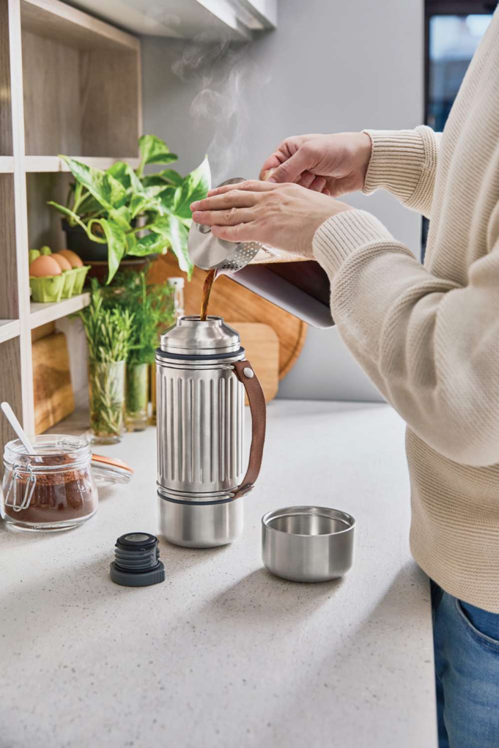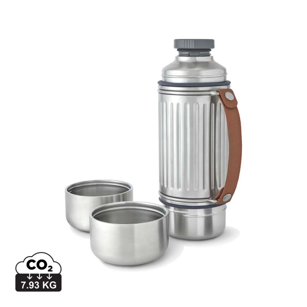 Denna vakuumisolerade flaska i rostfritt stål (1L) passar alla äventyr – från vandring till skidåkning. Håller drycker varma eller kalla i upp till 24 timmar. Den är helt läckagesäker och har ett stållock med enkel hällmekanism samt två dubbelväggiga koppar i rostfritt stål för att dela med sig. De breda kopparna står stadigt även på ojämna underlag, och ett tjockt nylonband gör den lätt att bära eller hälla med. Silikontätning förhindrar spill och flaskan tål diskmaskin (utan remmen).