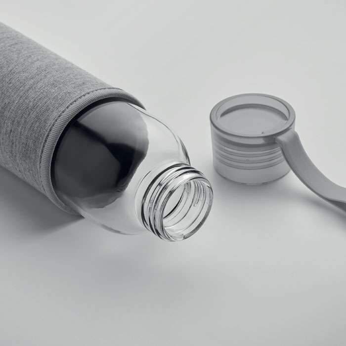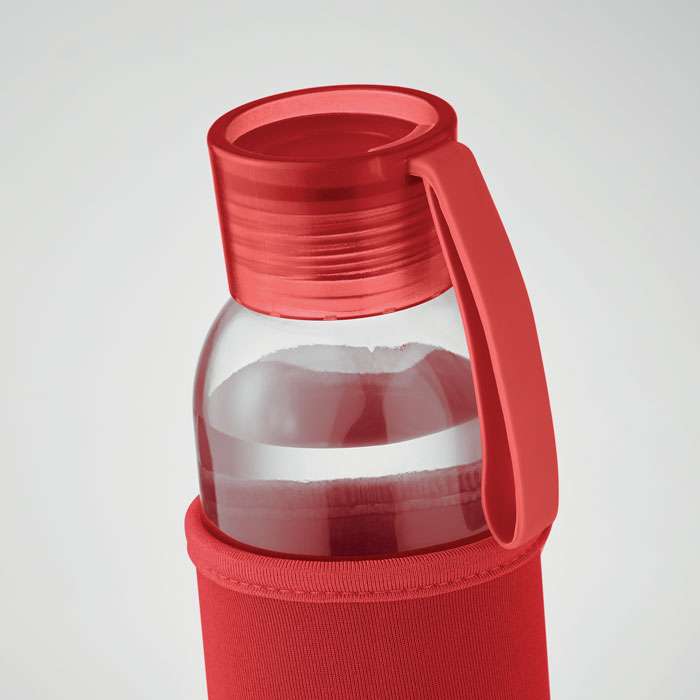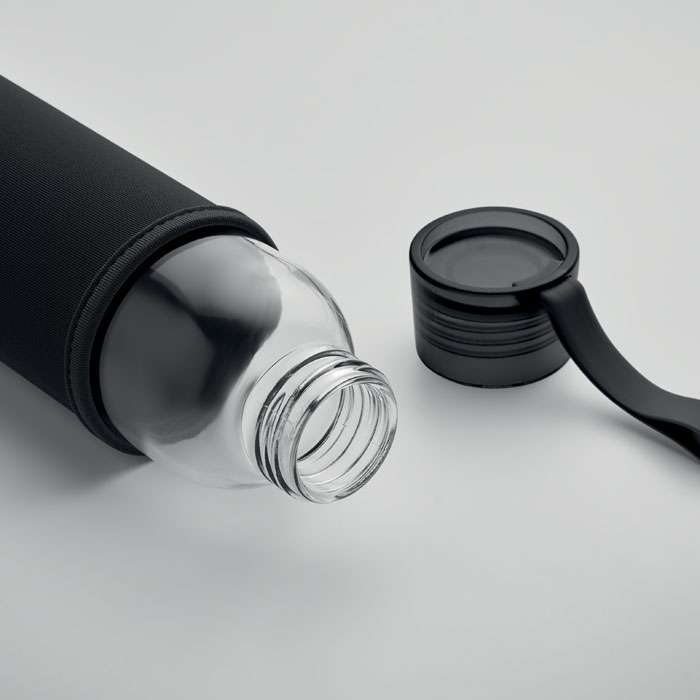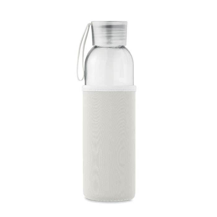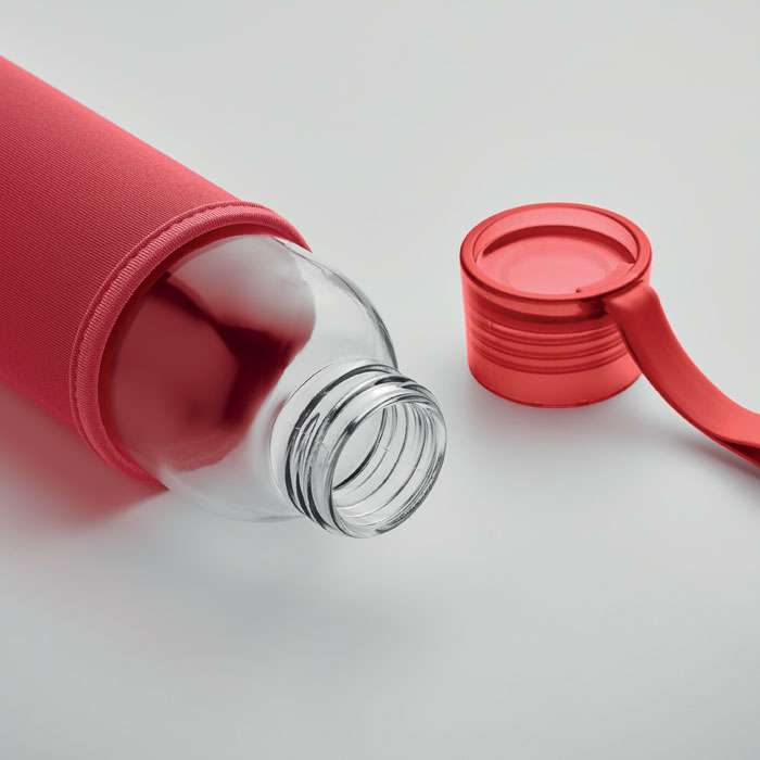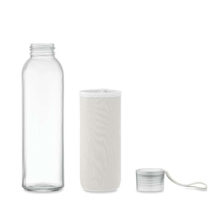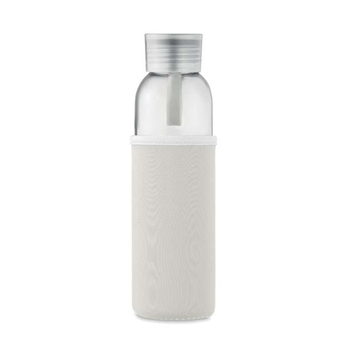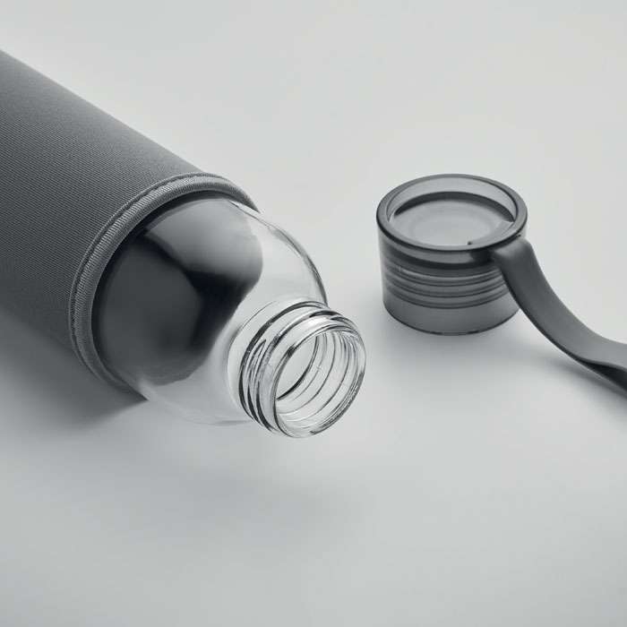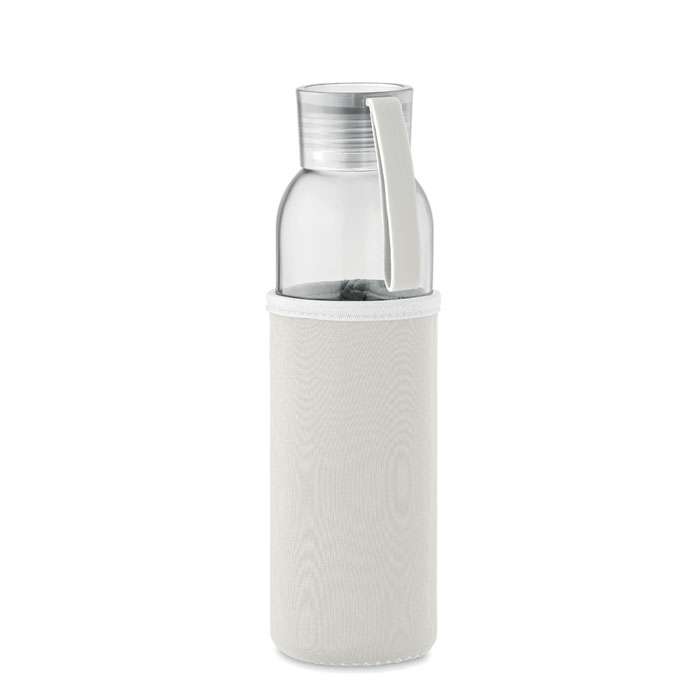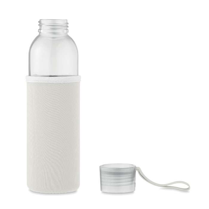 Glasflaska i återvunnet glas med neoprenpåse och PP-lock med silikonhängare. Läcker inte. Volym: 500ml.