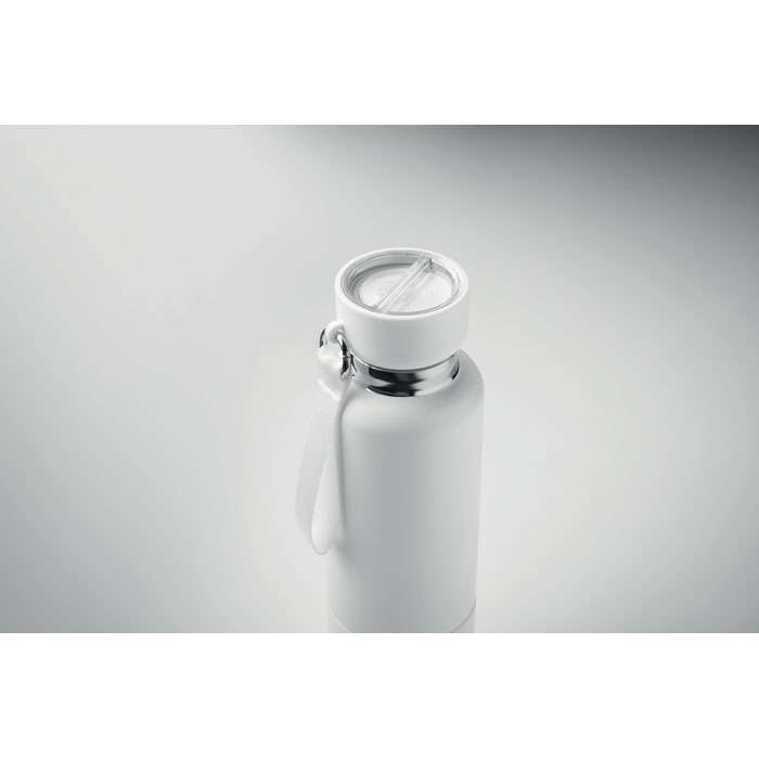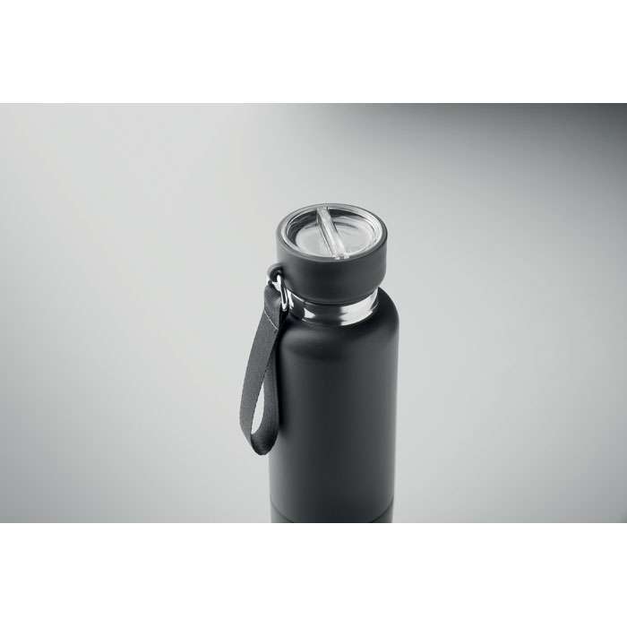 Dubbelväggig isolerad flaska i 90% återvunnet rostfritt stål och 10% rostfritt stål, med integrerat remhandtag och extra lång rem (70 cm) i PP-lock. Läckagefri. Bottenmugg ingår. Volym: 500 ml.