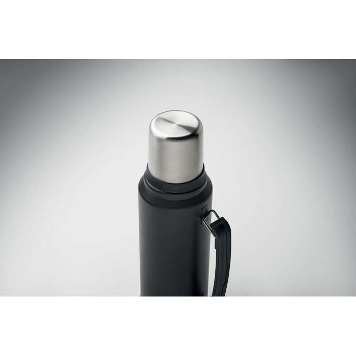 Dubbelväggig vakuumisolerande flaska i återvunnet rostfritt stål (90% återvunnet rostfritt stål och 10% rostfritt stål) med handtag på sidan. Lock i PP och mugg i återvunnet rostfritt stål. Läckagefri. Volym: 1L.