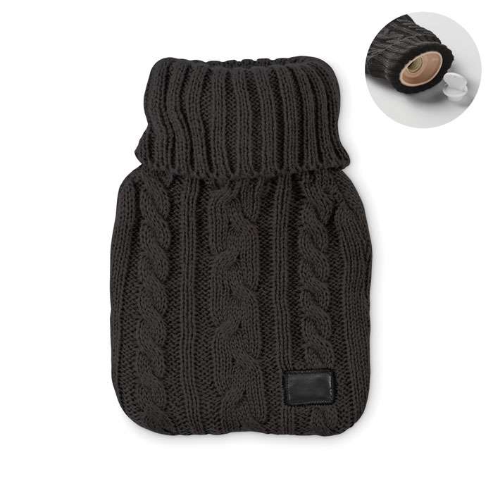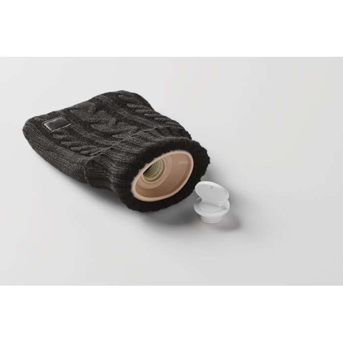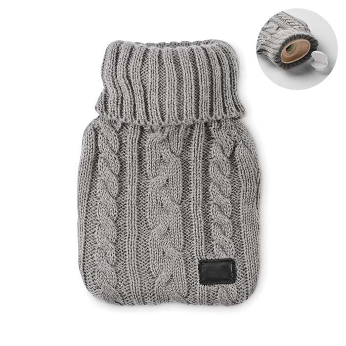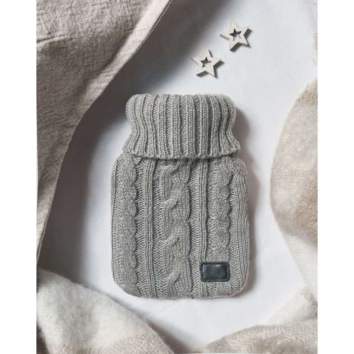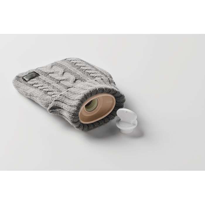 Varmvattenflaska med stickad påse i akryl. Används för att ge värme, vanligtvis i sängen, men även för att tillföra värme till en specifik del av kroppen. Volym: 400 ml.