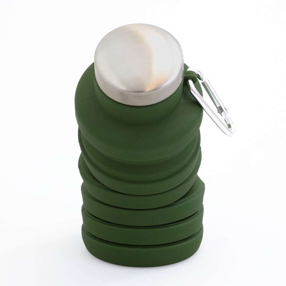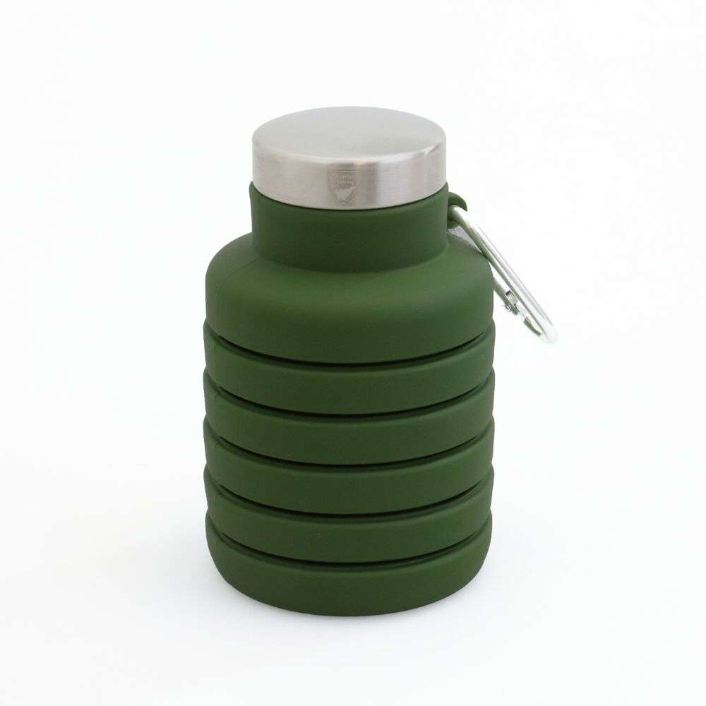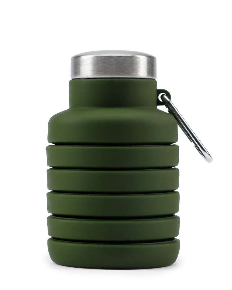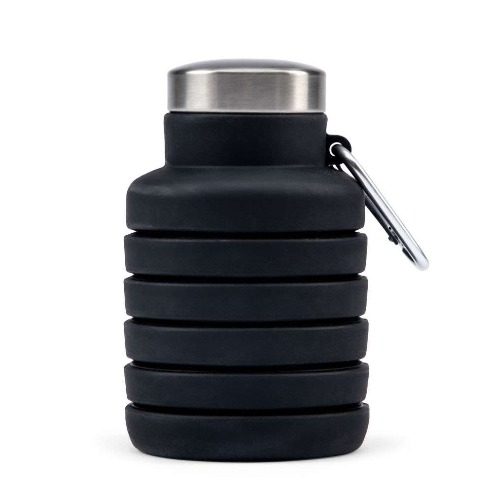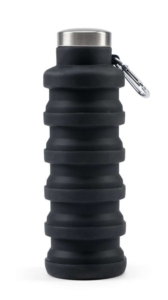 Flaska i silikon som du lätt kan trycka ihop och dra isär för att göra större eller mindre. I toppen finns en karbinhake för att hänga på exempelvis ryggsäcken. En perfekt outdoorprodukt för att minimera packningen.
