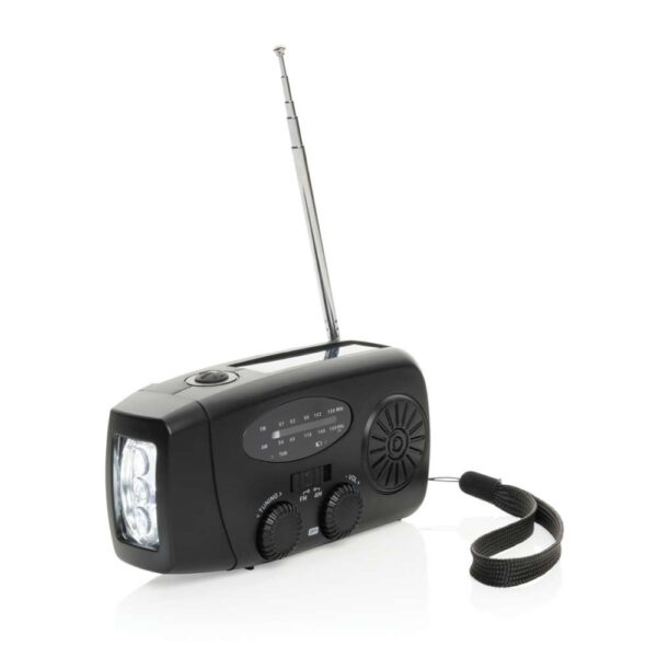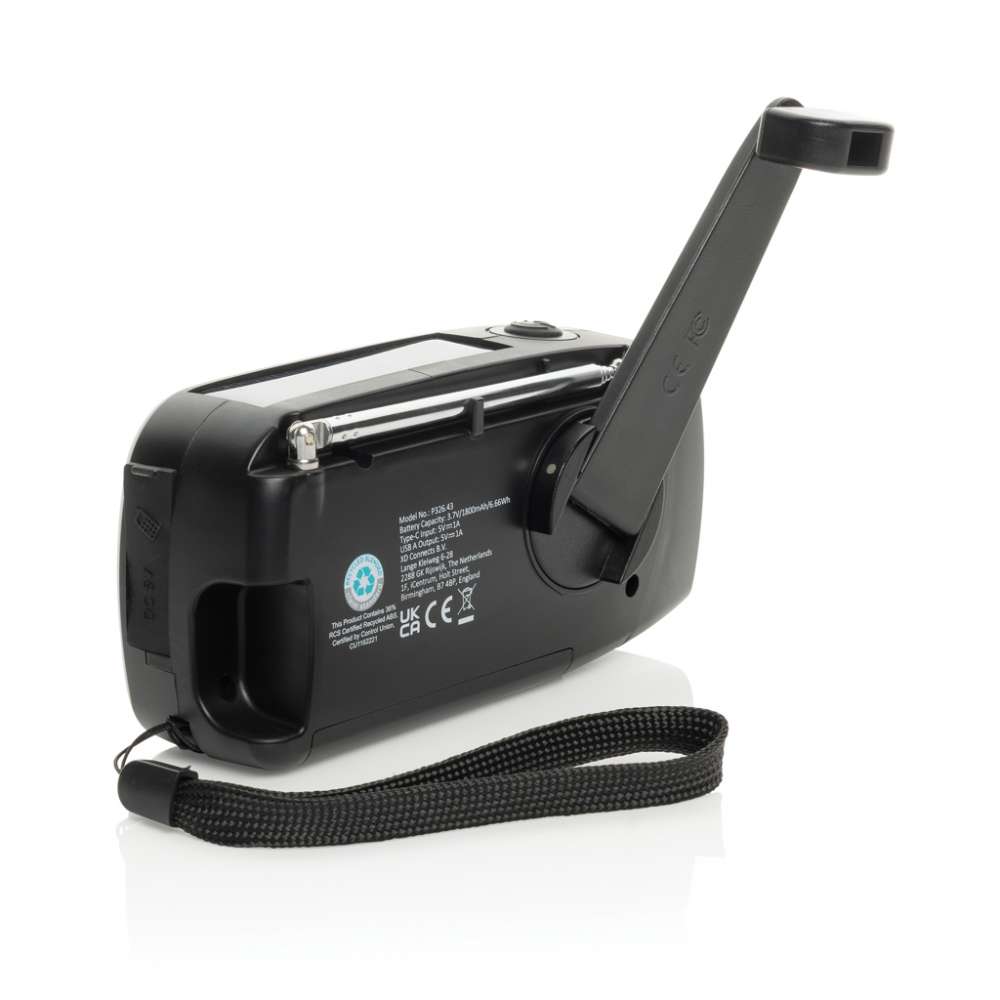 Var beredd på alla situationer med RescueWave, en mångsidig nödradio som är utformad för att hålla dig uppkopplad och strömförsörjd. Med AM/FM-radio, solpanel, en integrerad 1W-fackla, USB-utgång och USB C-ingång ser den här kompakta enheten till att du är utrustad för oväntade ögonblick. Med ett inbyggt 1800mAh-batteri kan RescueWave laddar du din telefon enklet. Handvevsmekanismen ger pålitlig funktion – bara 1 minuts vevning ger 5 minuters radio eller 30 minuters ficklampa, vilket gör den till ett viktigt verktyg i nödsituationer. När radion är fulladdad klarar den upp till 15 timmars radiosändning eller 8 timmars ficklampsljus. Tillverkad av RCS-certifierade återvunna material, inklusive återvunnen ABS-plast. RCS (Recycled Claim Standard) är en standard för att verifiera det återvunna innehållet i en produkt genom hela leveranskedjan. Totalt återvunnet innehåll: 38% baserat på artikelns totala vikt. Artikel och tillbehör är PVC-fria och förpackade i FSC®-förpackningar.