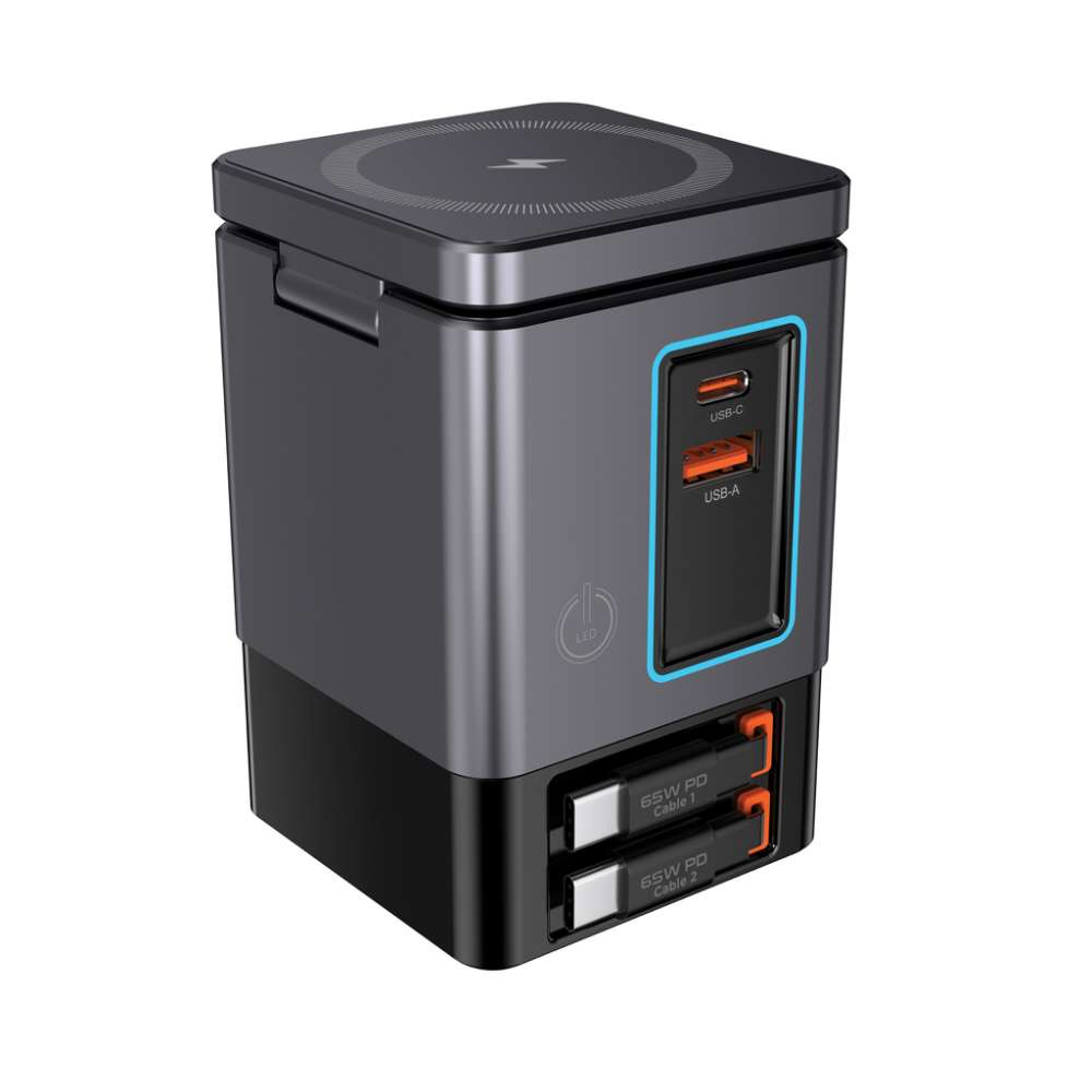 Sacramento är en 105 W GaN-laddningsstation som kombinerar maximal effekt med inbyggd bekvämlighet. Den har två integrerade utdragbara 65 W USB-C-kablar, så att du alltid har snabb laddning till hands – utan extra kablar. Behöver du fler alternativ? Sacramento har även en USB-A- och en USB-C-port, vilket ger dig totalt fyra utgångar för att ladda bärbara datorer, surfplattor, smartphones och mycket mer – samtidigt. För dina trådlösa enheter är Sacramento utrustad med en kraftfull 15 W magnetisk trådlös laddare som håller din telefon säkert på plats, plus en separat trådlös laddningsplatta som är speciellt utformad för mindre föremål som öronsnäckor eller AirPods (max 5 W). Sacramento levererar hög prestanda med en kompakt, effektiv design – den alstrar mindre värme och använder energi mer effektivt än traditionella laddare. Sacramento är tillverkad av RCS-certifierad (Recycled Claim Standard) återvunnen brandsäker PC. Totalt återvunnet innehåll: 26 % baserat på produktens totala vikt.