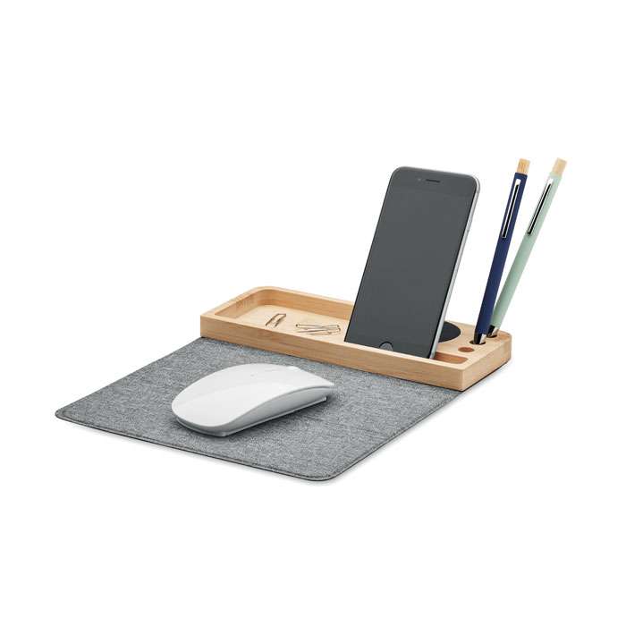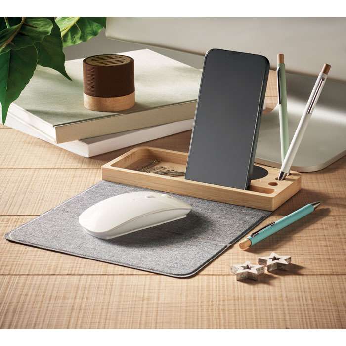 Trådlös laddare och skrivbordsorganisatör i bambu med telefonställ, 3 pennhållare och vikbar RPET-musmatta. Uteggekt: DC 9V/1,67A (15W).
