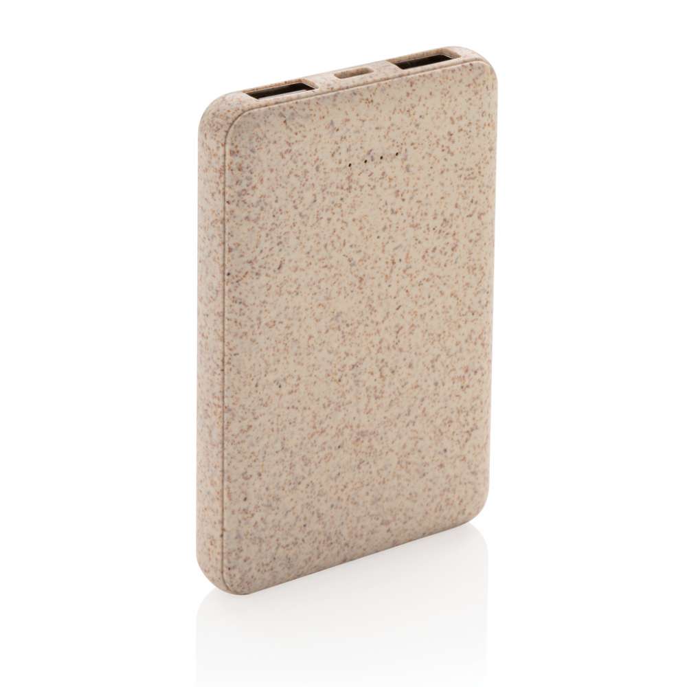 Ultrakompakt 5.000 mAh powerbank i fickformat tillverkad av vetefiber (35%) och ABS. Fulladdad kan du använda powerbanken för att ladda upp din mobiltelefon upp till tre gånger. Powerbanken har ett långvarigt A-graderat 5.000 mAh högdensitet litiumpolymer-batteri. Med dubbel USB port. Indikatorn visar energinivån så att du vet när det är dags att ladda upp. Input 5V/2A. Output USB 1: 5V/2A Output USB 2: 5V/1A
