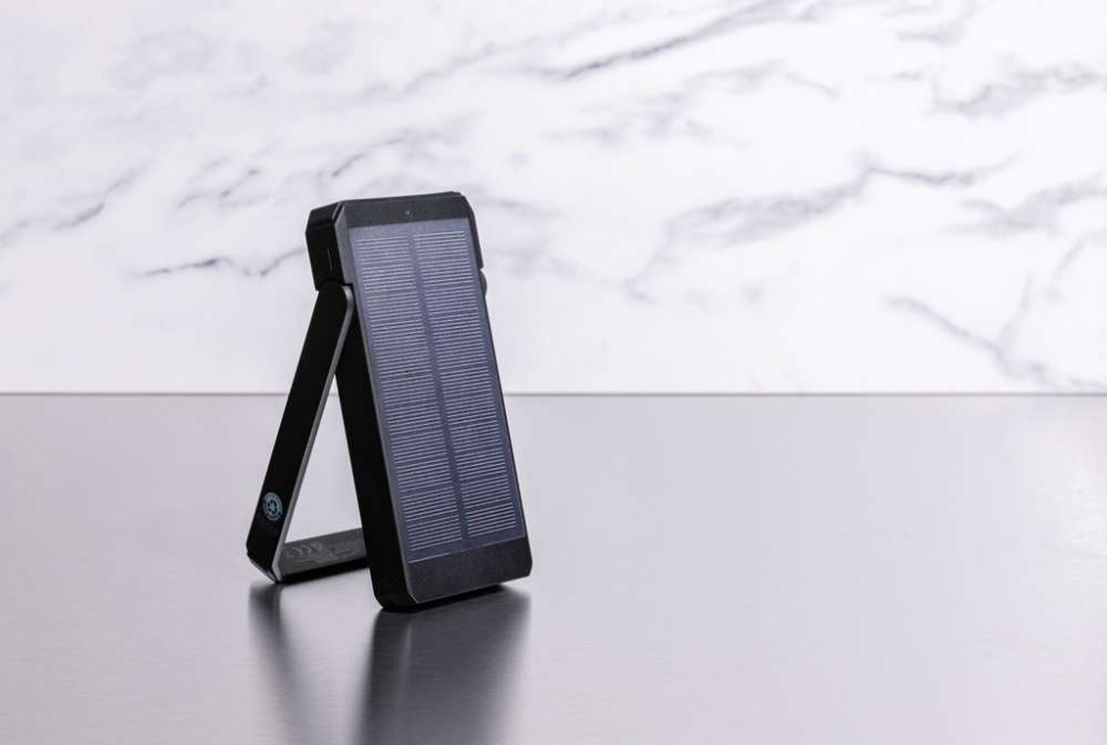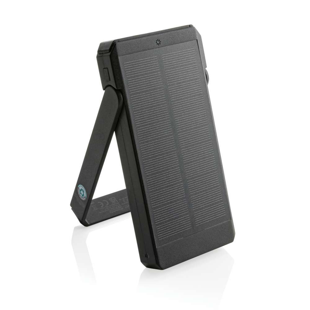 10.000 mAh solcellspowerbank tillverkad av RCS-certifierad återvunnen ABS. Totalt återvunnet innehåll: 18% baserat på total produktvikt. RCS-certifiering garanterar en helt certifierad leveranskedja för de återvunna materialen. Powerbanken använder högkvalitativa monokristallina solcellspaneler med 19% omvandlingsgrad. Laddningshastigheten beror på förhållandena. Med integrerad stativfunktion för att använda solcellspanelerna i en optimal vinkel. Powerbanken innehåller ett långvarigt 10.000 mAh litiumbatteri av klass A. Laddningshastighet sol: 5V/200mA. Input type C: 5V/2A. Output: USB A: 5V/2A Type C: 5V/2A. Produkt och tillbehör är PVC-fria. Laddningskabel i RCS-certifierad återvunnen TPE medföljer. Levereras i FSC®-mixförpackning. Registrerad design®.