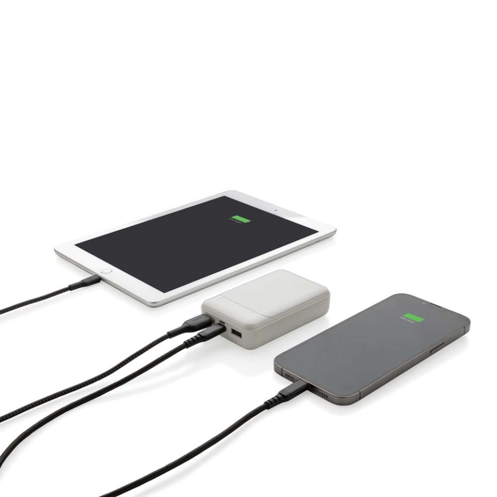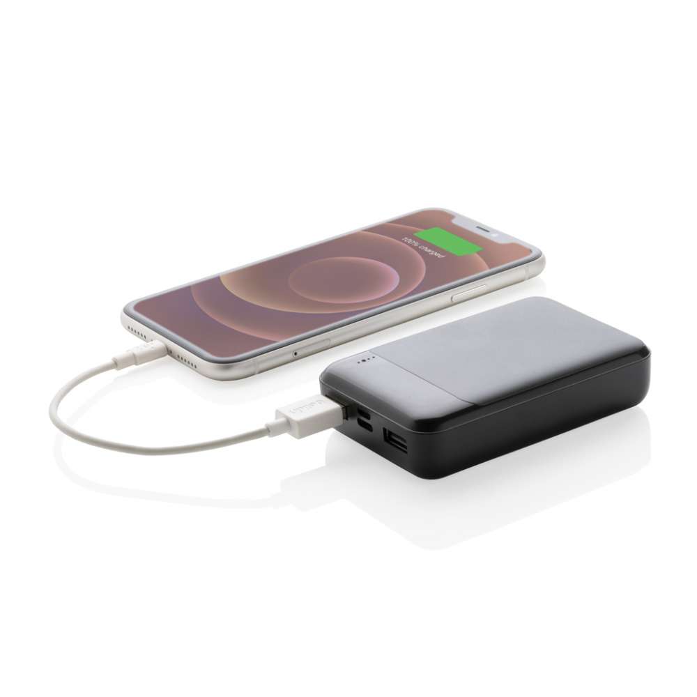 10.000 mAh powerbank i fickstorlek där höljet är tillverkat av RCS certifierad återvunnen ABS. RCS (Recycled Claim Standard) är en standard för att verifiera återvunnet innehåll i en produkt genom hela leveranskedjan. RCS är den standard som används när en del av en produkt är tillverkad av återvunna material. Totalt återvunnet innehåll: 20% baserat på total produktvikt. Du kan ladda din telefon upp till fem gånger med en fulladdad powerbank. Powerbanken har ett långvarigt A-graderat 10.000 mAh högdensitet lithium polymer-batteri. Strömindikatorn visar energinivån så att du vet när det är dags att ladda på nytt. Micro USB Input 5V/2A; Type-C Input 5V/2A; USB output 5V/2A; produkt och accessoarer är 100% PVC-fria. PVC-fri laddningskabel i återvunnen TPE medföljer.