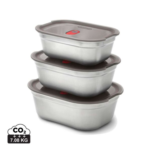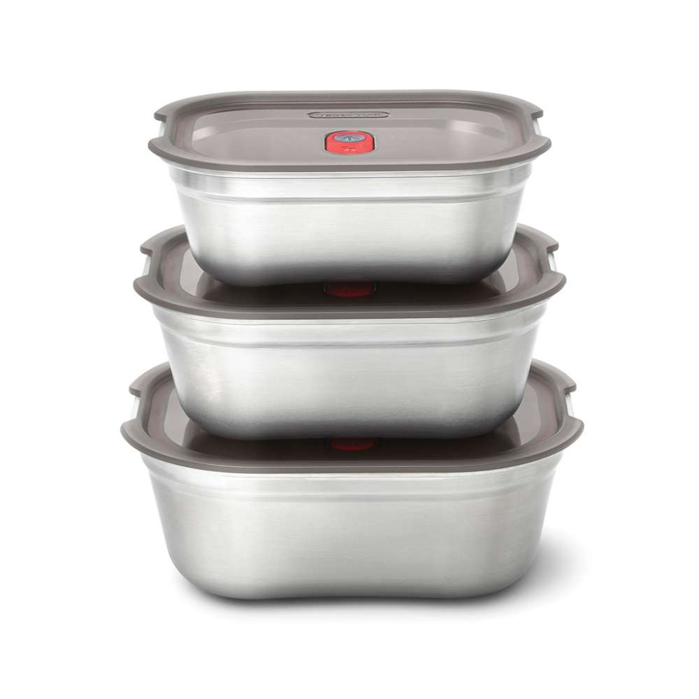 Detta set med tre matlådor, small, medium och large, i rostfritt stål är perfekt för vardagsbruk. De är mikrovågssäkra, lätta, tåliga och 100 % läckagesäkra. Varje låda har ett vakuumförseglat lock med ventil, så du kan värma maten i mikron utan att ta av locket – snabbt och utan stänk. Det halvtransparenta locket gör det enkelt att se innehållet. Behållarna tål diskmaskin, frys och ugn (locket tål inte ugn) och är enkla att rengöra tack vare avtagbara tätningar. De är stapelbara, BPA-fria och designade för att spara plats