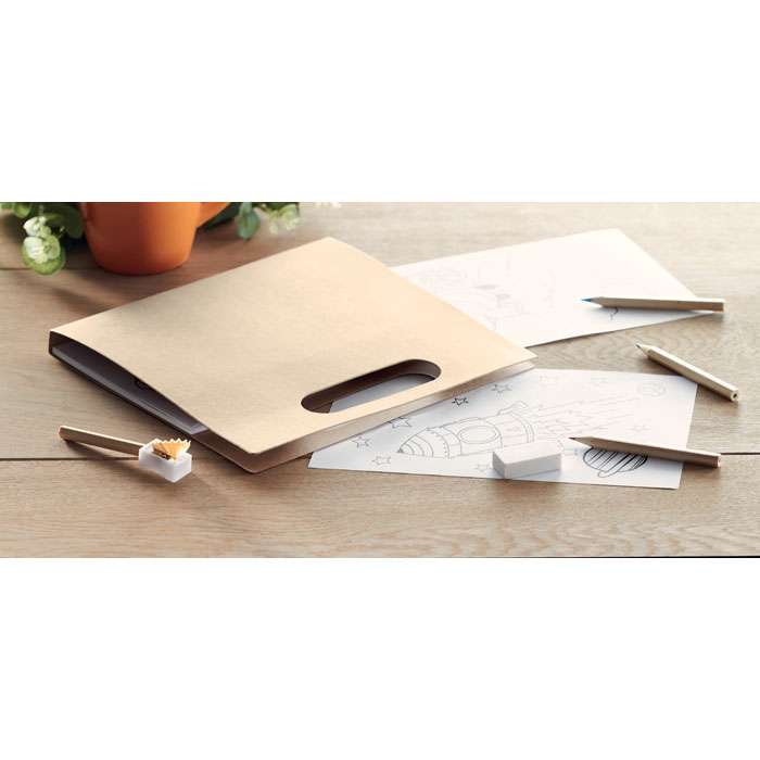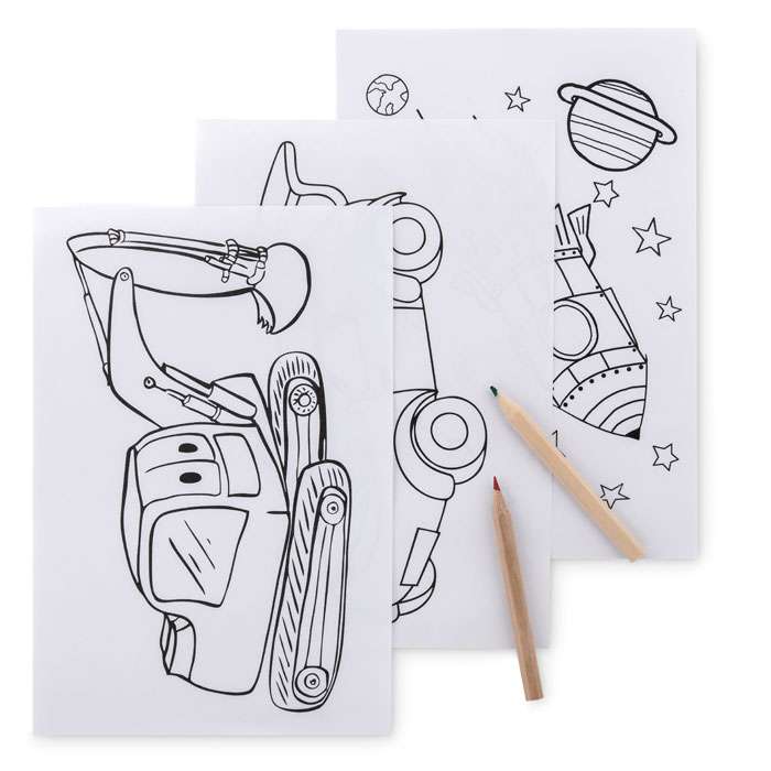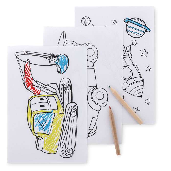 Ritset för barn med 30 blad att färglägga. Innehåller 6 färgpennor, pennvässare och suddgummi.