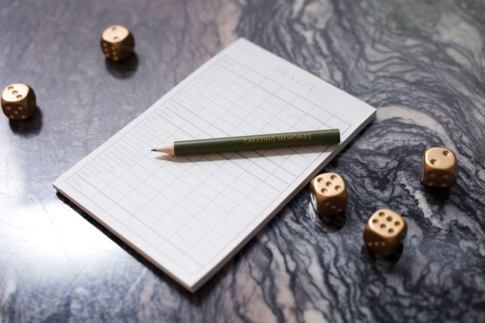 Här kommer Yatzy i lyxförpackning! Med tärningar i guld och med en lika exklusiv penna, höjer vi Yatzy till Bratzy. Allt liggande i en stilig ask tryckt med guldtext, är detta spel både rolig att ge bort och att ha liggande framme på soffbordet.