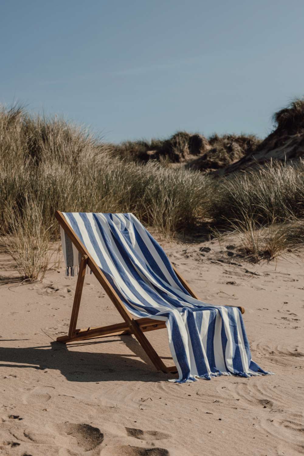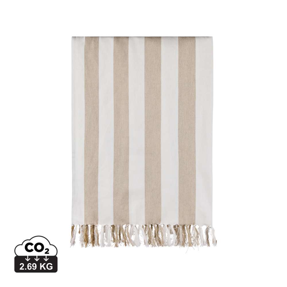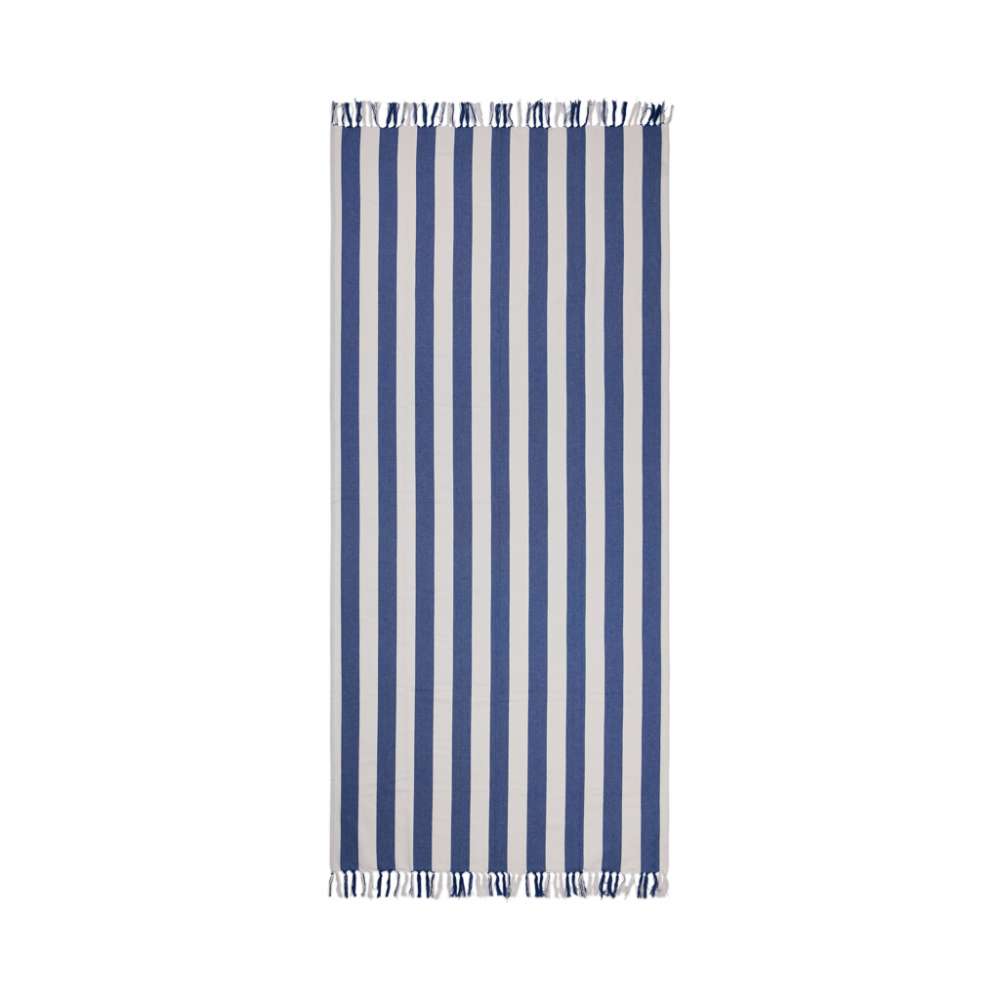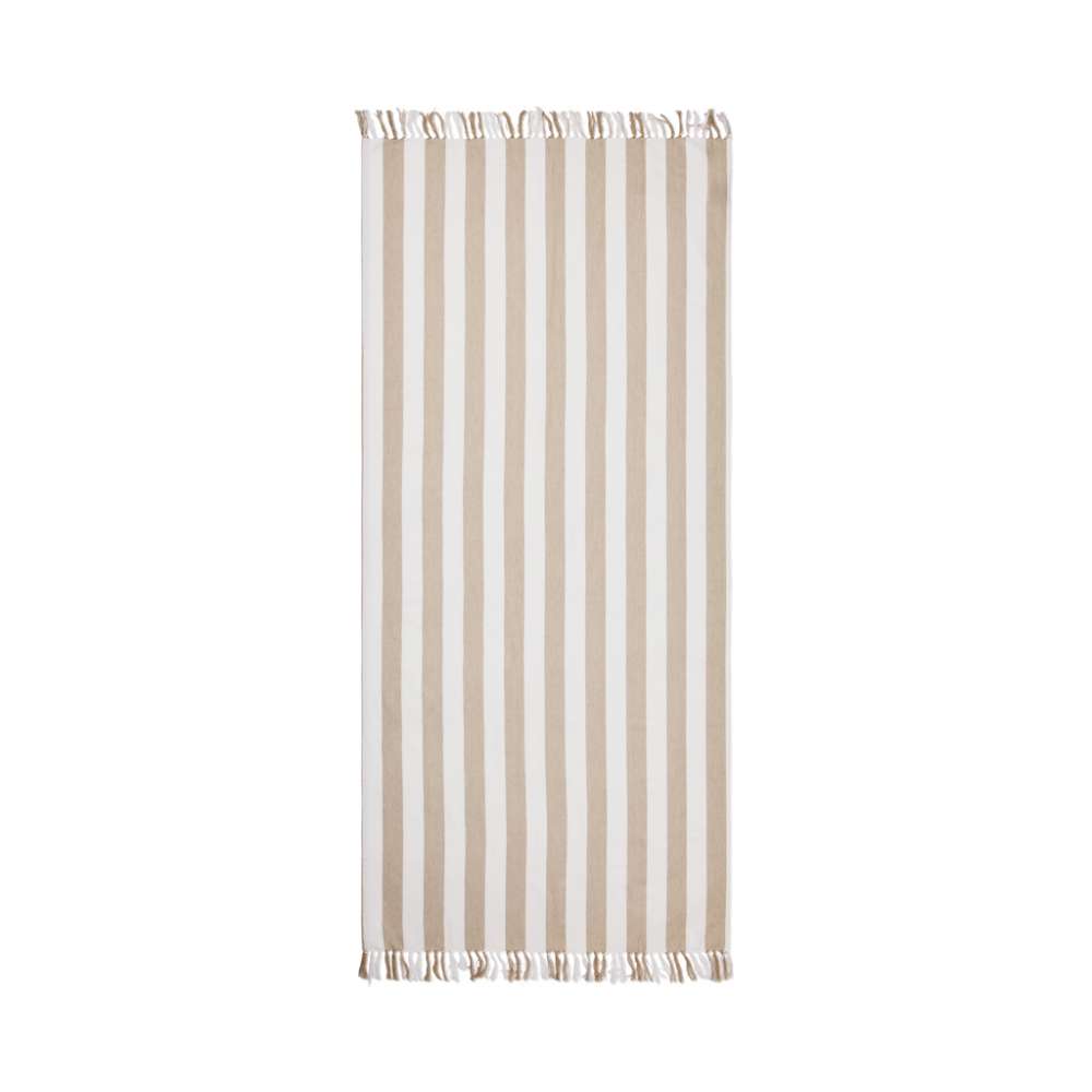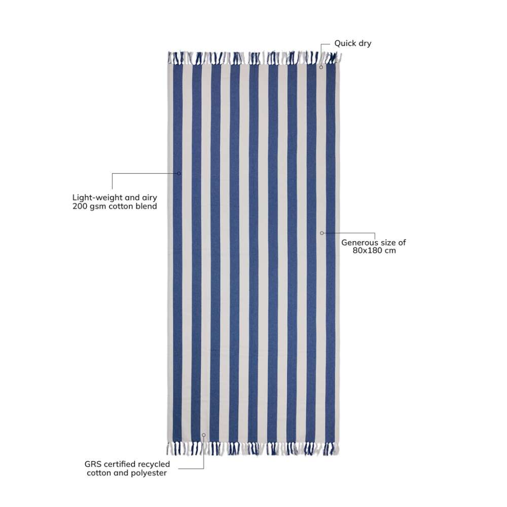 Denna hamam-handduk har ett tvåfärgat randigt mönster och fransar längs kortsidorna. Tillverkad i en lätt och luftig blandning på 200 gsm, kombinerar den bomullens mjuka komfort med polyesterns snabbtorkande egenskaper. Med sina generösa mått på 80×180 cm är handduken idealiskt för både stranddagar och poolhäng. Certifierad enligt GRS (Global Recycled Standard), GRS-certifieringen garanterar att hela leveranskedjan av återvunna material är certifierad. Det totala återvunna innehållet baseras på produktens totala vikt. Denna produkt innehåller 68% GRS-certifierad återvunnen bomull och 29 % GRS-certifierad återvunnen polyester.