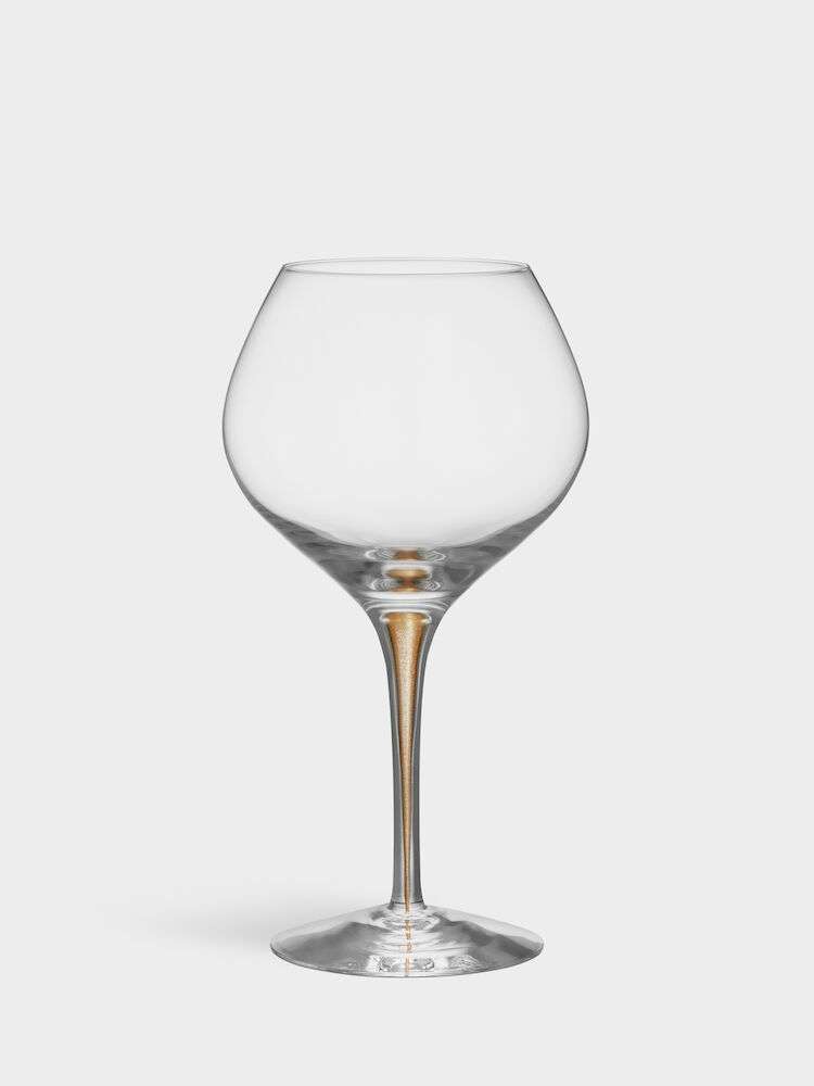 Våra hantverkare och Erika Lagerbielke har länge försökt fylla Intermezzos karakteristiska bubbla med guldpigment. Äntligen finns den där, inbakad i det kristallklara glaset – en matt guldskimrande droppe. Bouquet glaset rymmer 70 cl och passar enastående till alla röda viner med friska, fruktiga smaker, oavsett druva. Den överdimensionerade, breda kupan hjälper vinet att utvecklas. Glaset är munblåst i Sverige av våra skickliga glasblåsare. Design av Erika Lagerbielke.