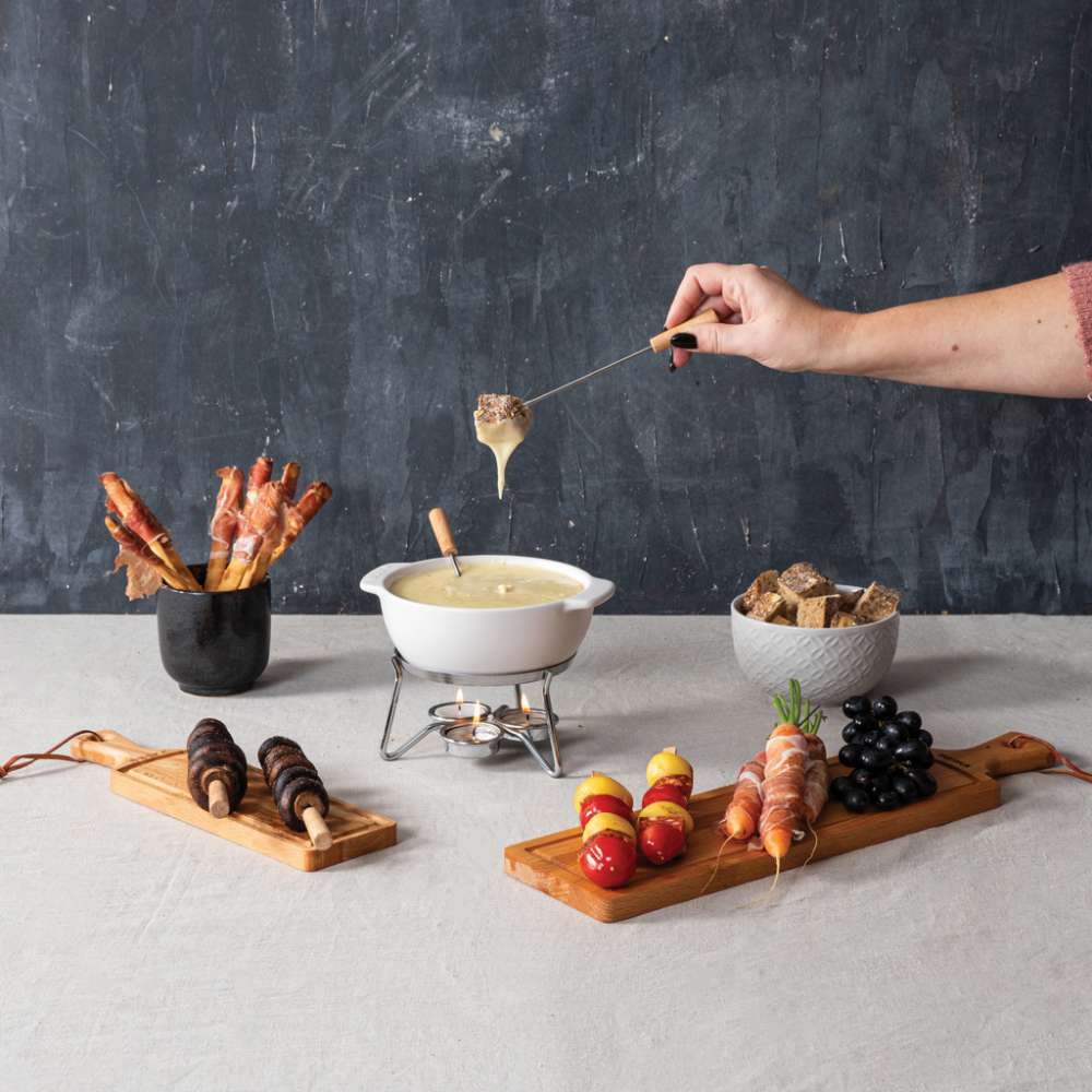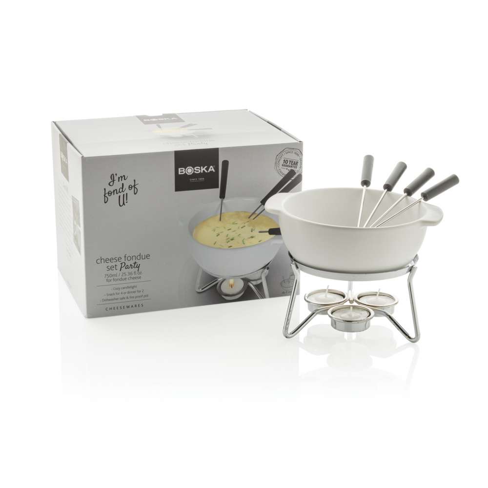 Ostfonduesetet Party från märket BOSKA – ett B Corporation-certifierat företag – kan användas för att tillaga 500 gram ostfondue eller 750 ml varm sås. Värm bara upp det i mikrovågsugnen och doppa! Den keramiska fonduegrytan håller värmen väl och håller din ostfondue läckert smidig och varm med hjälp av tre värmeljus. Perfekt för två till fyra personer. Fonduesetet är delvis diskmaskinssäkert; endast fonduegrytan och fonduegafflarna är diskmaskinssäkra. Dessutom kommer det med 10 års garanti