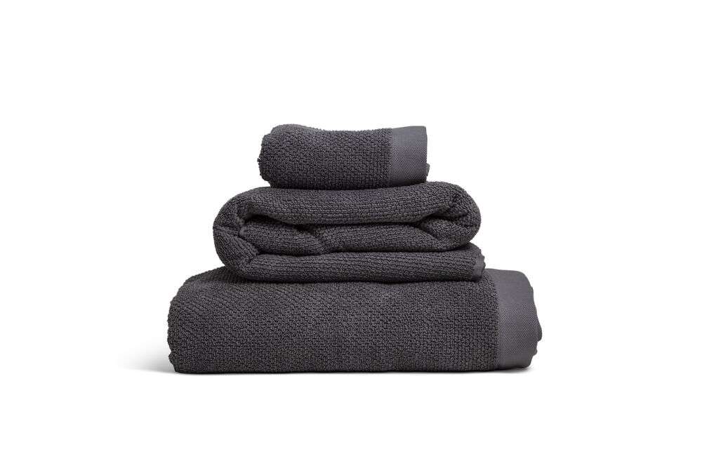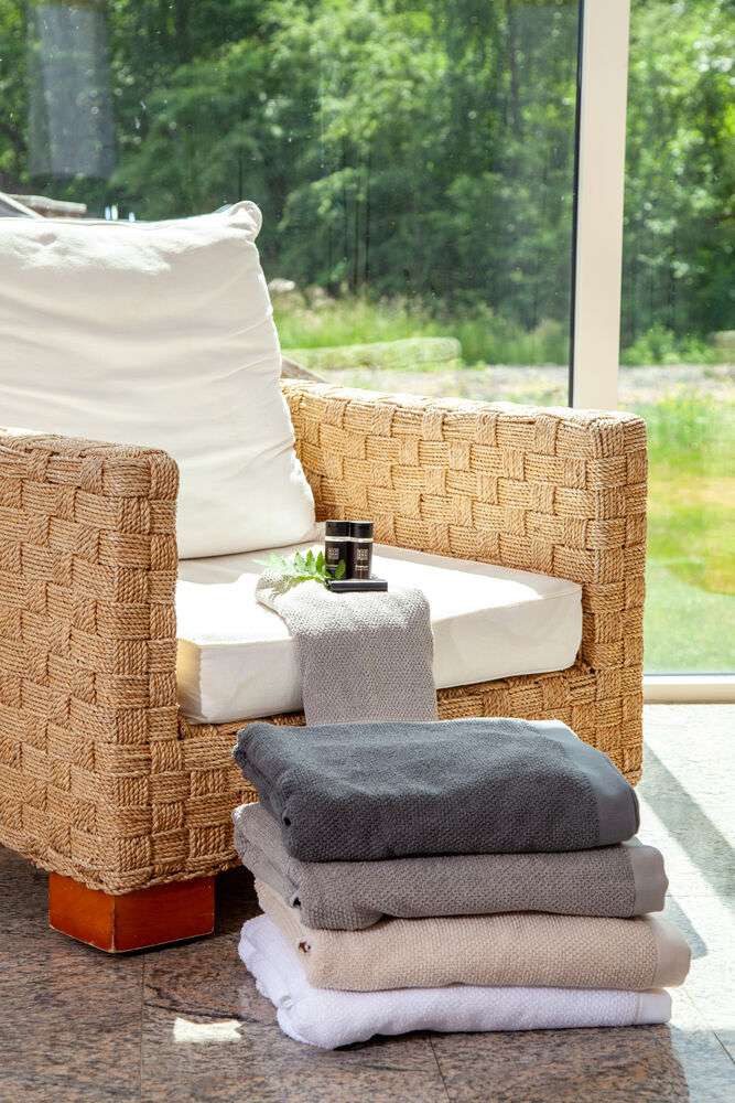 Ett fantastisk frottéset i ny och modern design. Frottén är strukturvävd på bägge sidor och har en blandning av bomull och lin för bra uppsugningsförmåga. En modern frotté med en nätt bård. Ökotex-certifierad.
