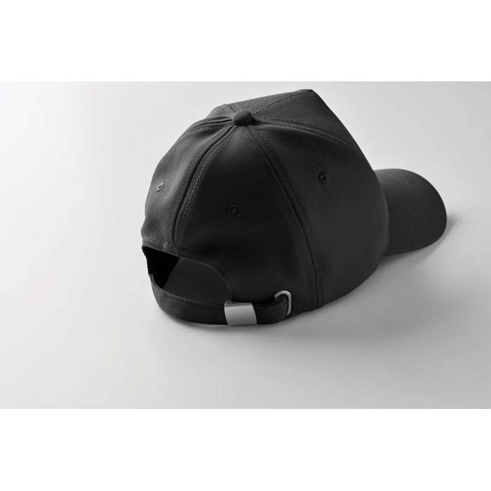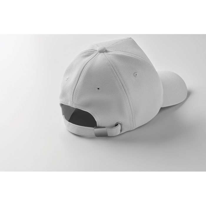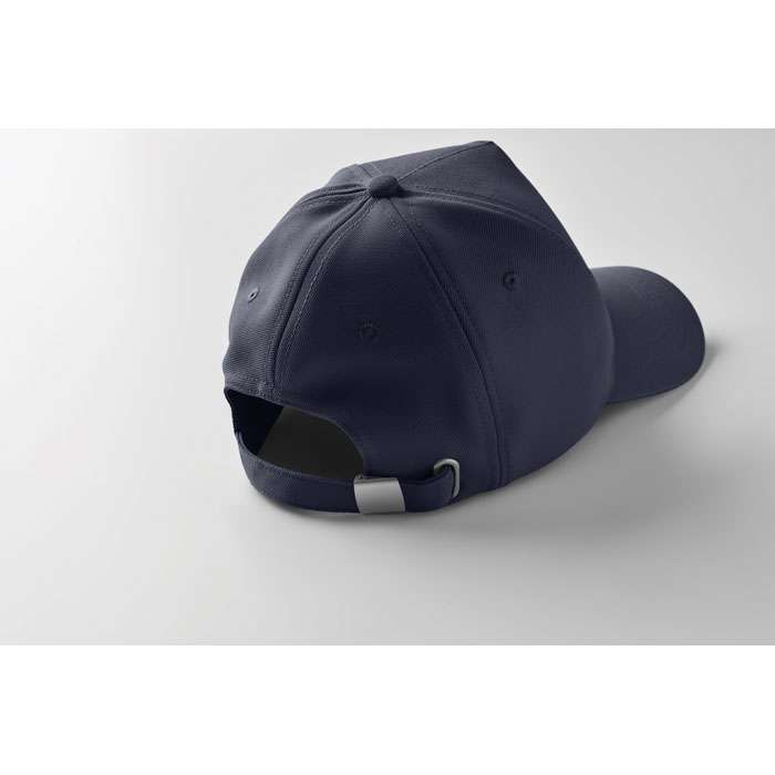 RPET 5-panels keps i polyester 210 g/m2 med silverfärgat stålspänne. 4 broderade öljetter i matchande färg. Storlek 58cm.