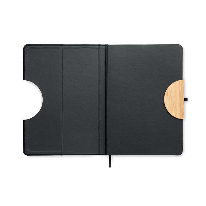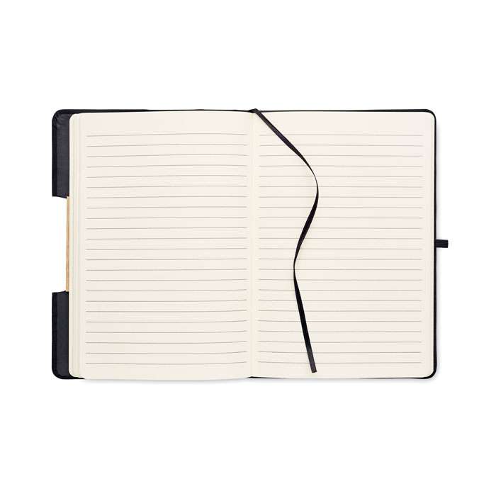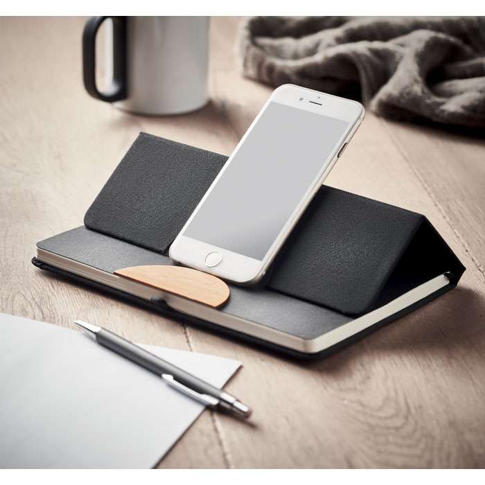 A5 anteckningsbok i 600D RPET-omslag med bambu-detaljer och en funktion för smartphone-stativ. Inbunden med hölje. 160st linjerade sidor (80 ark). 70 gsm återvunnet papper. Matchande elastiskt band, sidmarkeringsband och pennhållare. Ta med dig den här kontorsprodukten till nästa möte. Har du ett möte på distans? Fäll upp telefonhållaren och sätt in din enhet så att du inte behöver hålla den själv. FSC®-certified | FSC MIX CREDIT, P7.1, FSC-C213206