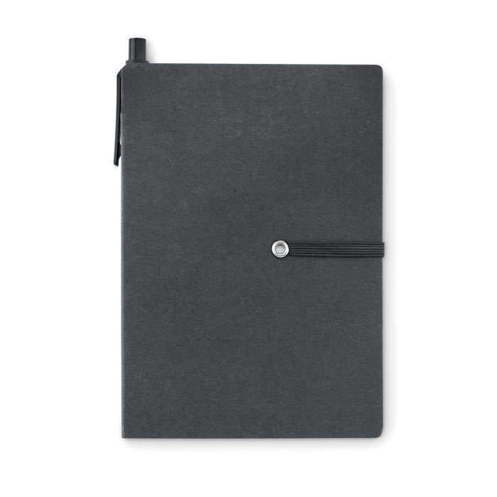 Anteckningsbok i återvunnet material, 70 sidor papper, post-it block och notisar. Elastiskt band runt boken och en penna med ABS-spets. Svart bläck. FSC®-certified | FSC MIX CREDIT, P7.1, FSC-C213206