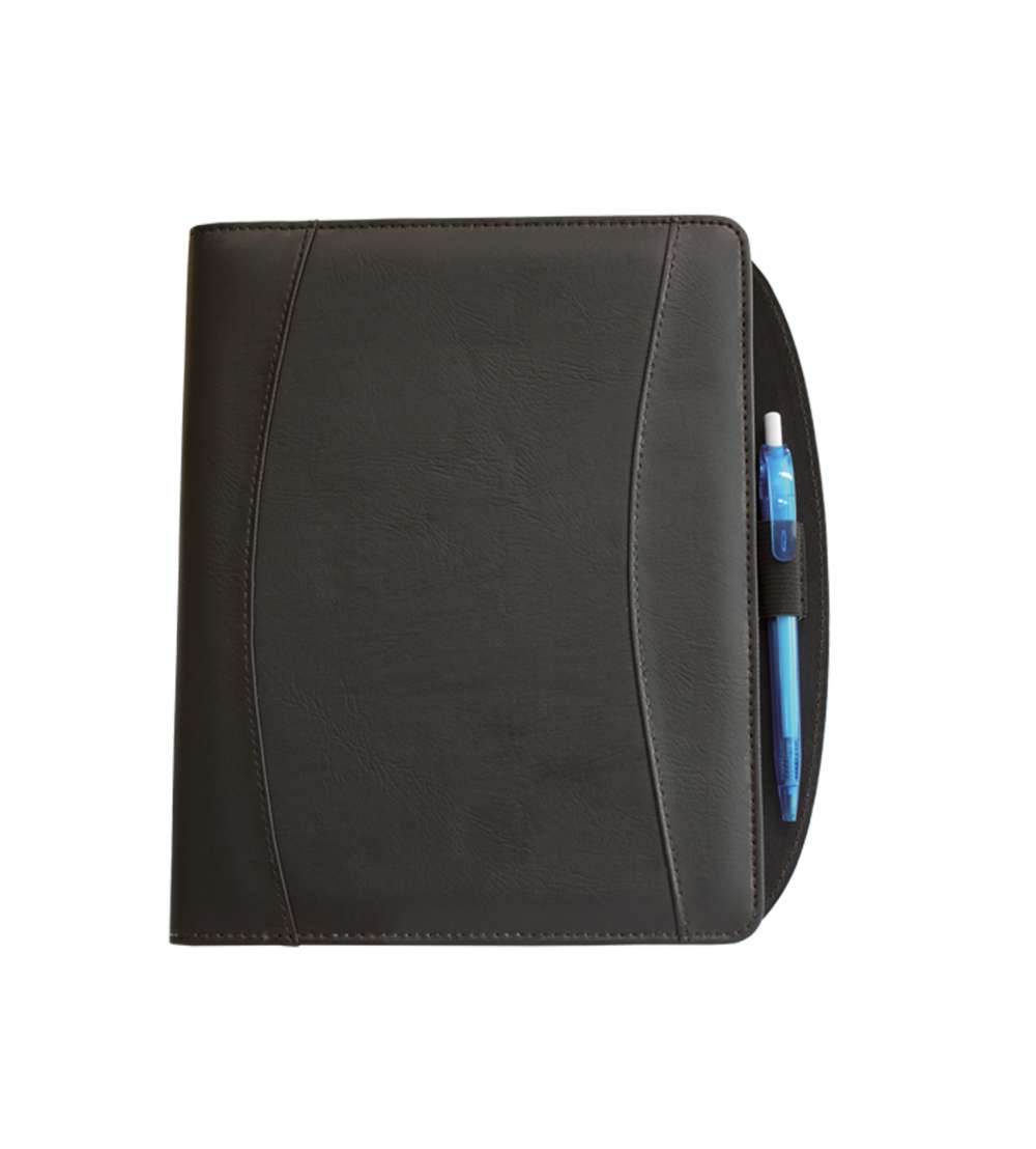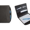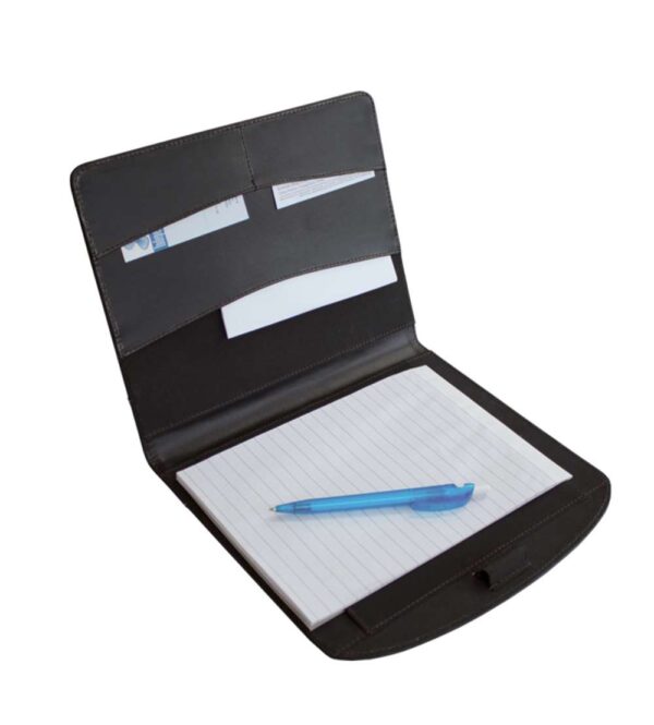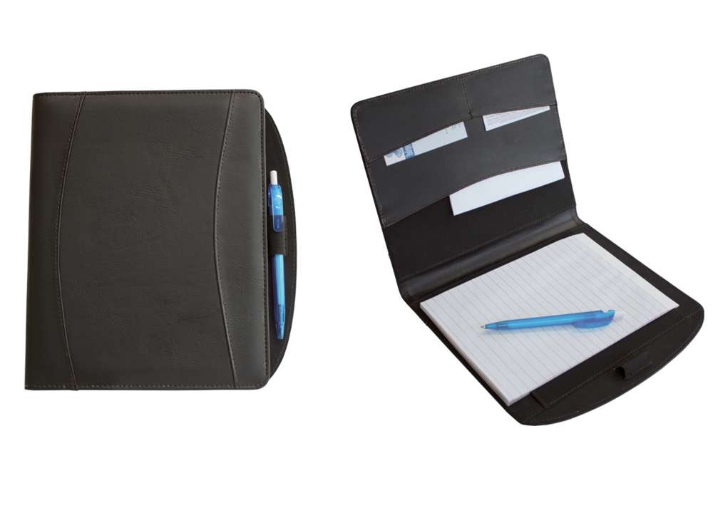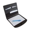 Mycket snyggt blockomslag i svart skinnimitation. Ett större fack och två mindre i kreditkortsstorlek, samt en pennhållare (penna ingår ej). Ett 20 sidigt linjerat block (A5) ingår. OBS! Märkning görs endast med en graverad silver alt. guldfärgad laminatbricka i metallfinish. Färgen på gravyren blir då svart.