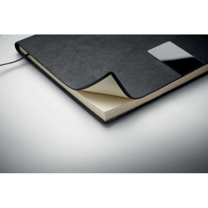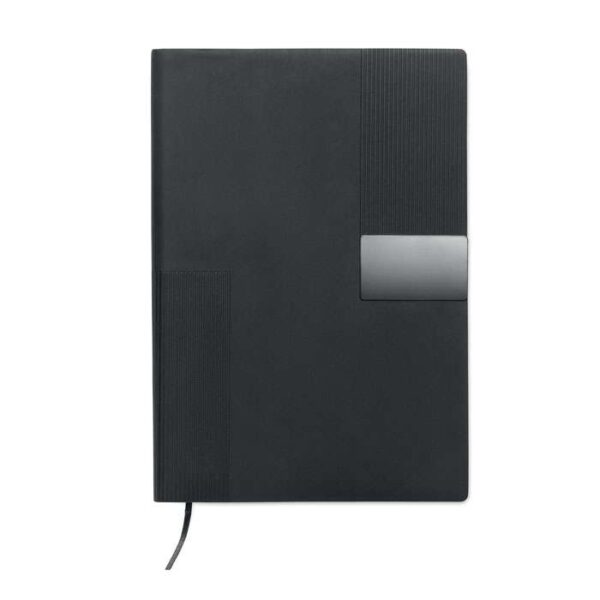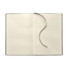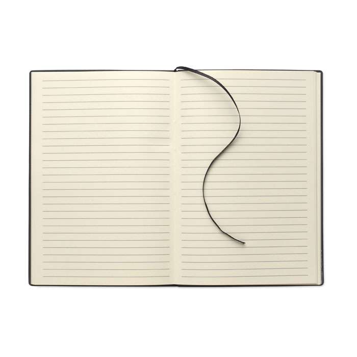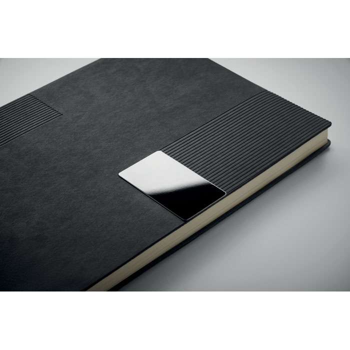 A5 PU-anteckningsbok med mjukt omslag. Inbunden. 160 linjerade sidor av återvunnet papper (80 ark). Matchande bokmärke i resårband och band. Detalj i metall på framsidan.