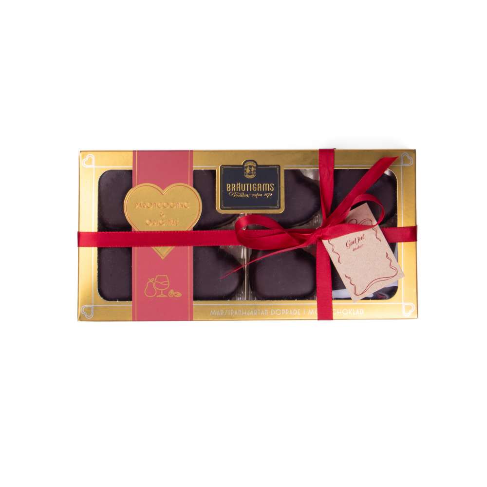 Handgjorda marsipanhjärtan doppade i mörk choklad.