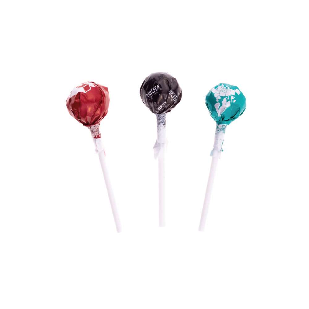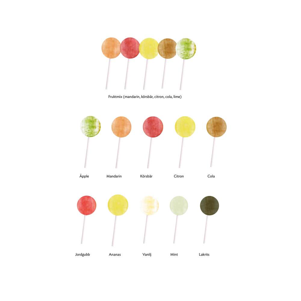 Runda klubbor med omslag i egen design. Tillgängliga smaker: Äpple, Mandarin, Körsbär, Citron, Cola, Jordgubb, Ananas, Vanilj, Mint eller Lakrits.