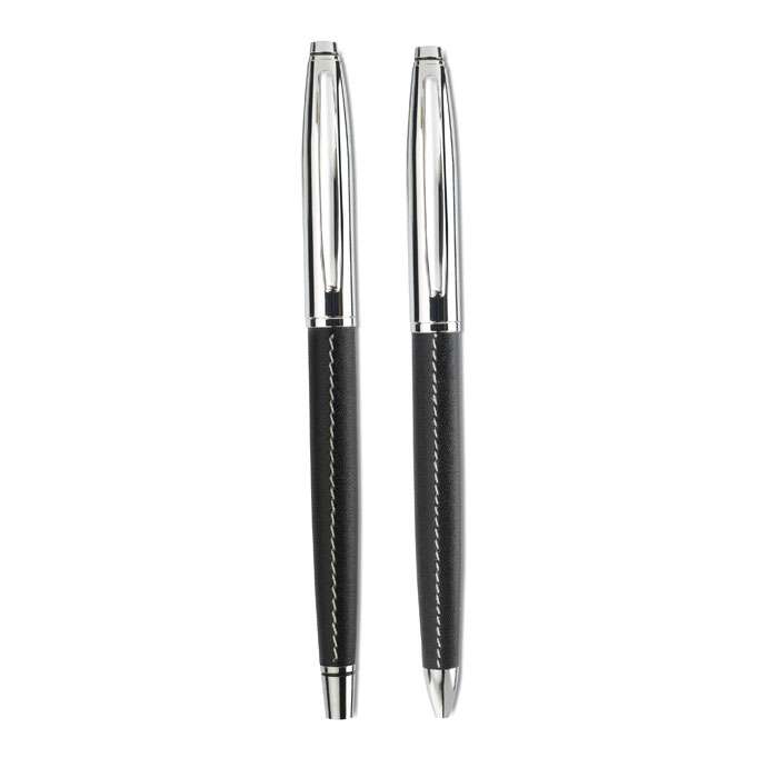 Set av kulspets. och rollerballpenna i metall, förpackad i PU läderfodral med dragkedja och kontrast sömmar. Blått bläck i kulspetspennan och svart bläck i rollerballpennan.