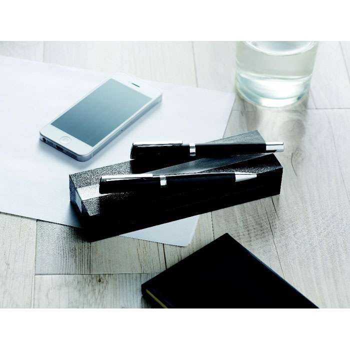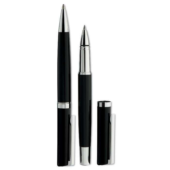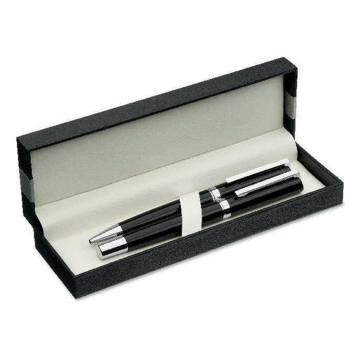 Pennset i mässing och rostfritt stål i presentförpackning. Kulspetspenna med vridfunktion, blått bläck och rollerball penna, svart bläck.