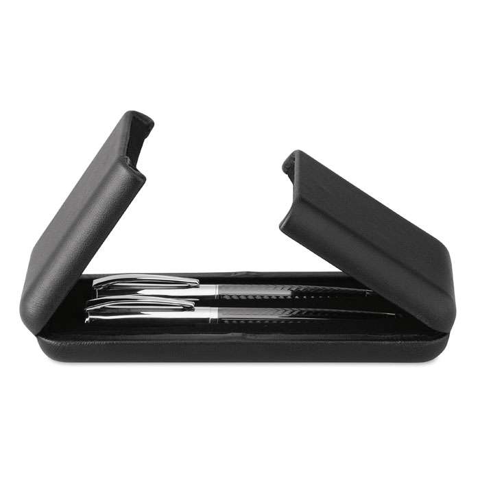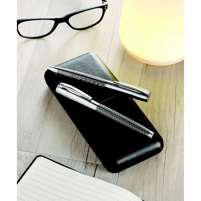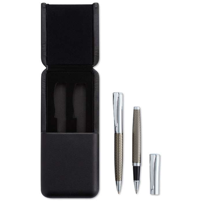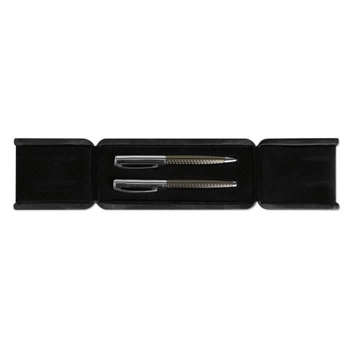 Pennset med reliefmönster i exklusiv presentförpackning. Kulspetspenna med vridmekanism och Rollerballpenna. Blått bläck.