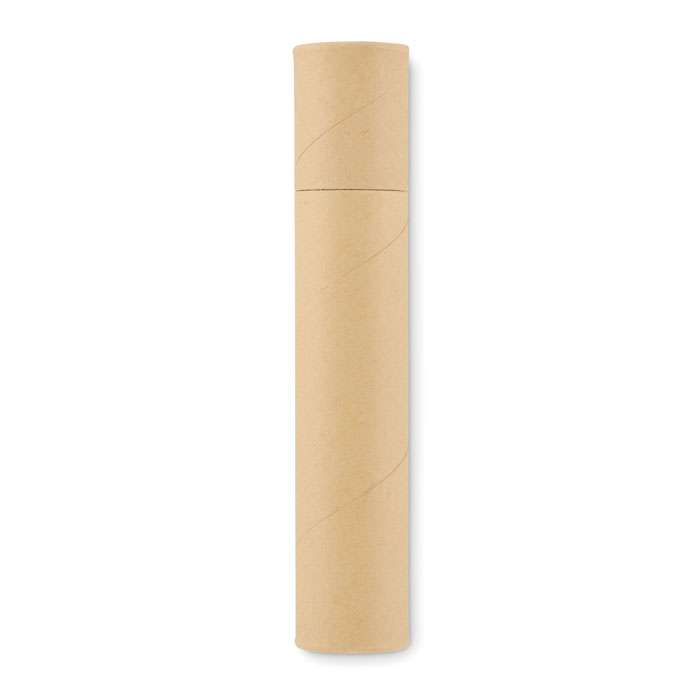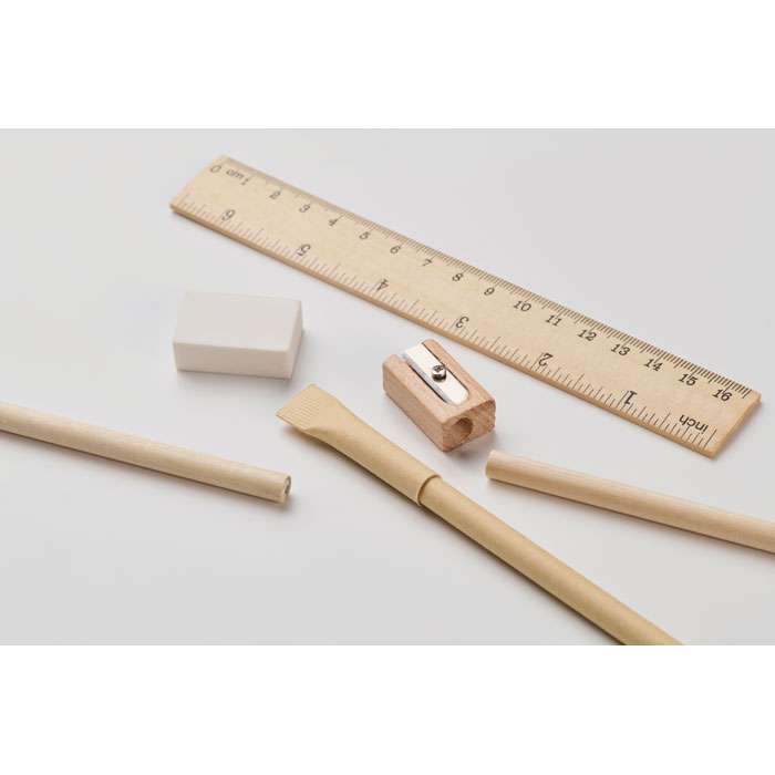 Återvunnet pappersrör med 2 blyertspennor, 1 papperspenna, 1 pennvässare och 1 suddgummi.
