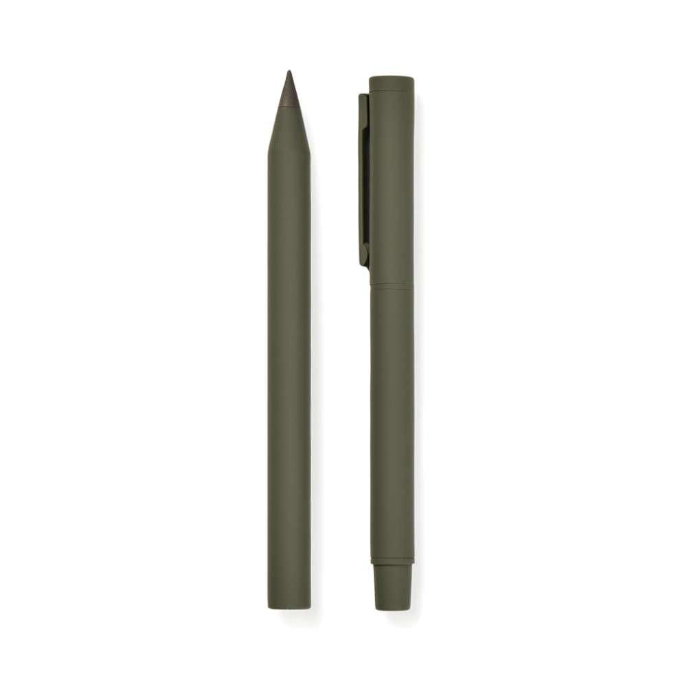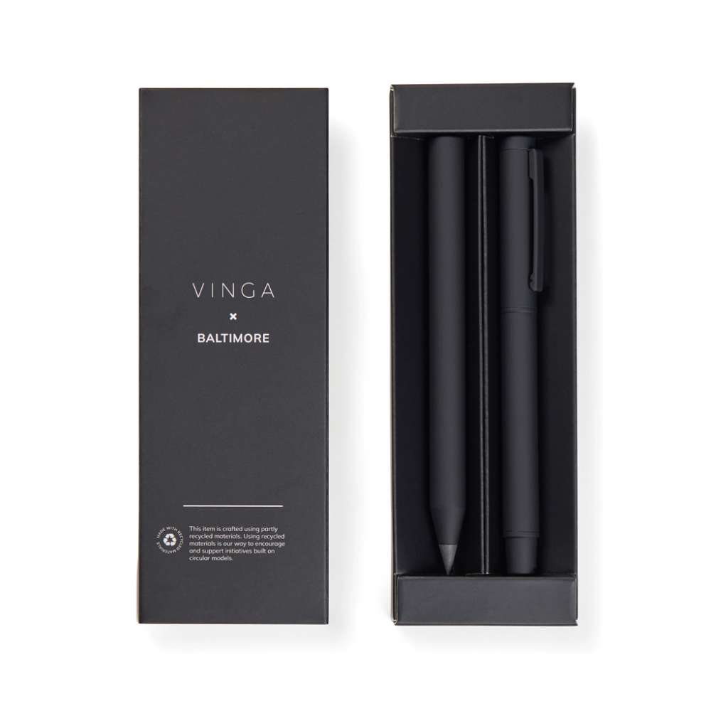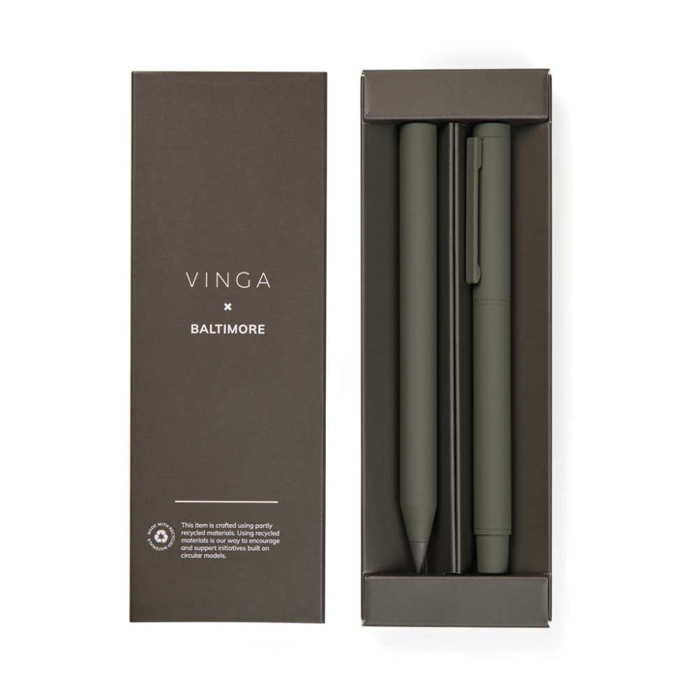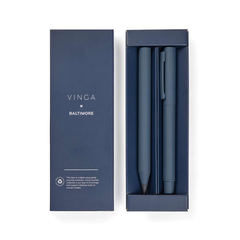 Detta moderna och stilrena set innehåller två pennor: en evighetspenna och en klassisk kulspetspenna med lock och klämma. Båda pennorna är designade med stil och funktionalitet i åtanke, tillverkade av RCS-certifierat återvunnet rostfritt stål och försedda med en gummiyta för ett bekvämt grepp och en matt finish. Med en balanserad vikt ligger de skönt i handen och gör skrivandet bekvämt och stabilt. Evighetspennan erbjuder obegränsat skrivande, medan kulspetspennan har en spets på 1,00 mm och ger en jämn och konsekvent skrift med dokumentblått bläck som räcker upp till 1200 meter. Certifierad enligt RCS (Recycled Claim Standard), RCS-certifieringen garanterar att hela leveranskedjan av återvunna material är certifierad. Det totala återvunna innehållet baseras på produktens totala vikt. Denna produkt innehåller 52 % RCS-certifierat återvunnet aluminium och 10 % RCS-certifierat rostfritt stål.