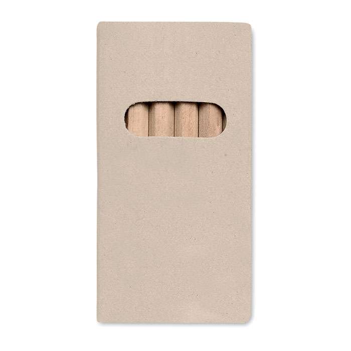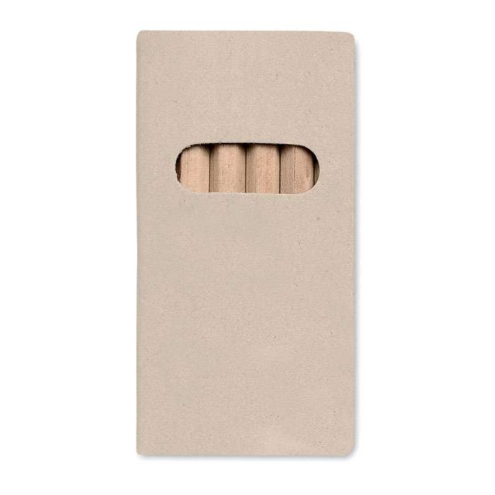 Set med 6 st färgade träpennor i en kartong av obehandlad papp.