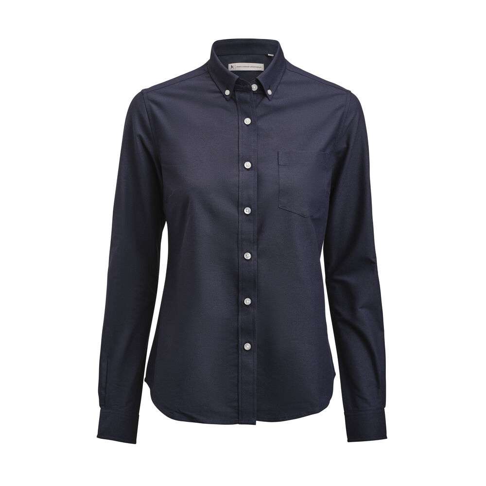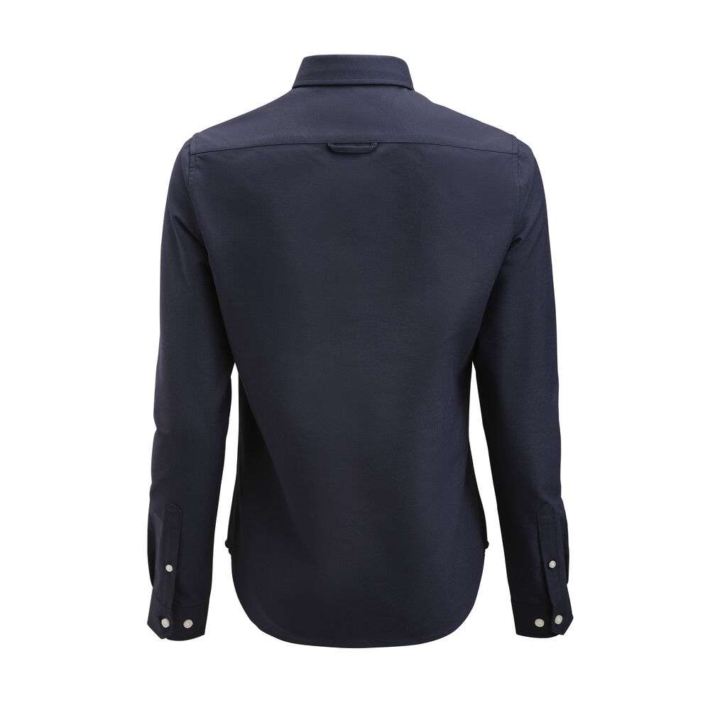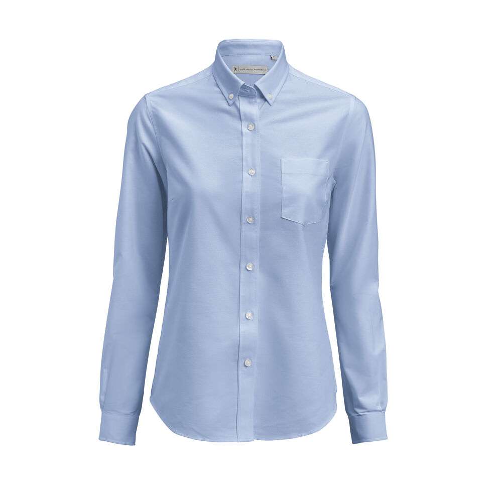 Oxford shirt with button down collar and chest pocket. Pearl coloured buttons attached with white button thread. Delivered in a biobased, compostable bag.