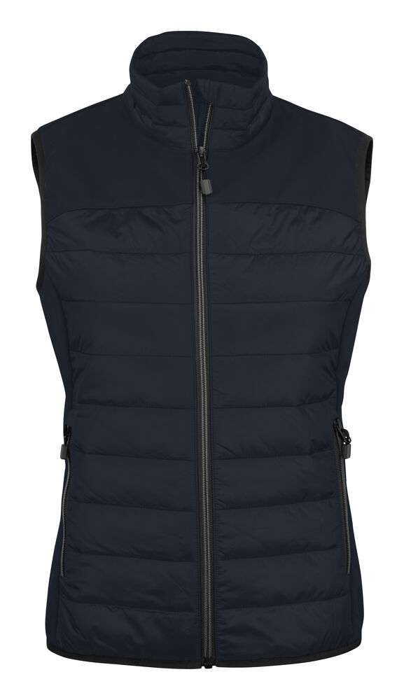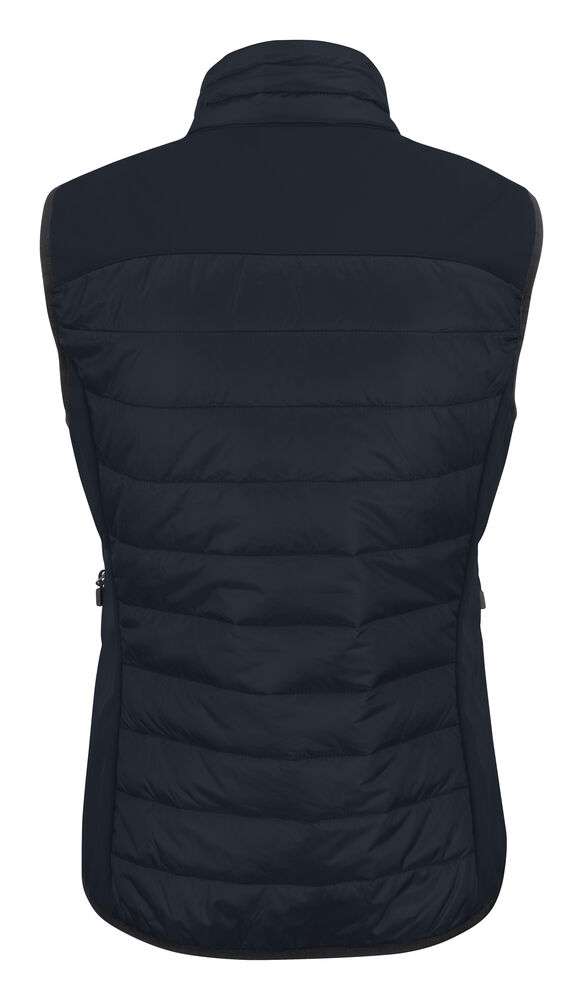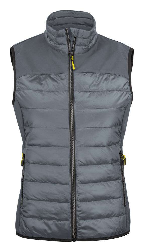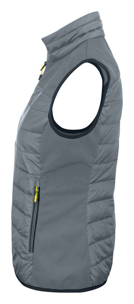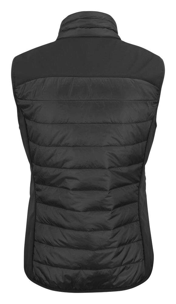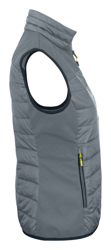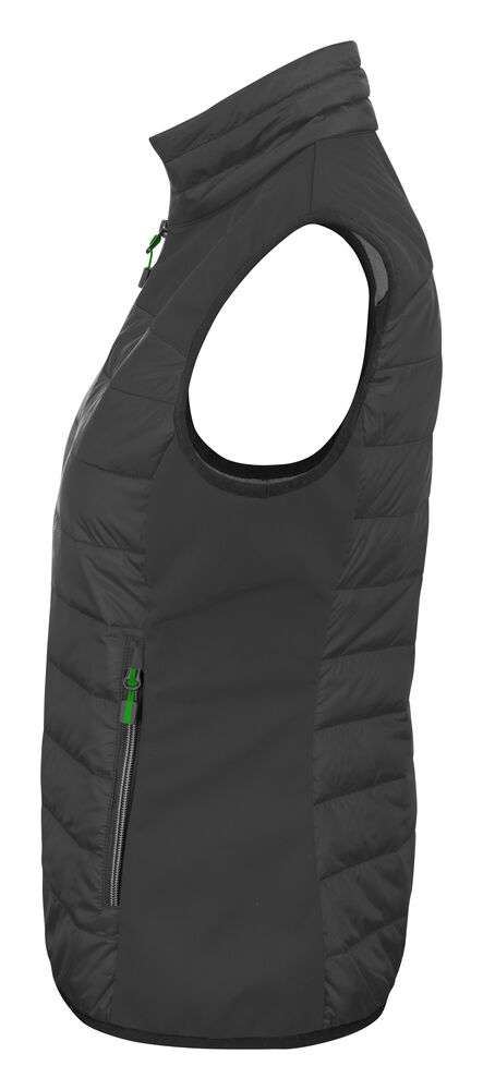 Softshell/ lättviktsväst. Oket, fram & bak, samtsidopaneler av softshell (tyg 1). Bål, fram & bak av vadderat lättviktsmaterial (tyg 2). Blixtlås och zip pullers i Printer Essentials-manér.