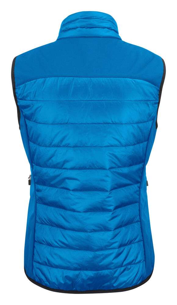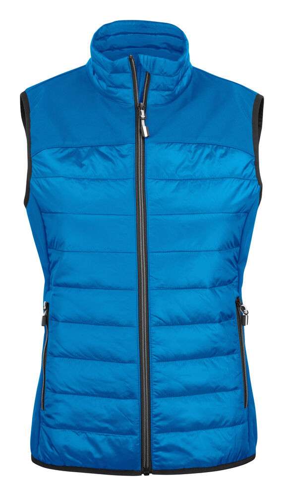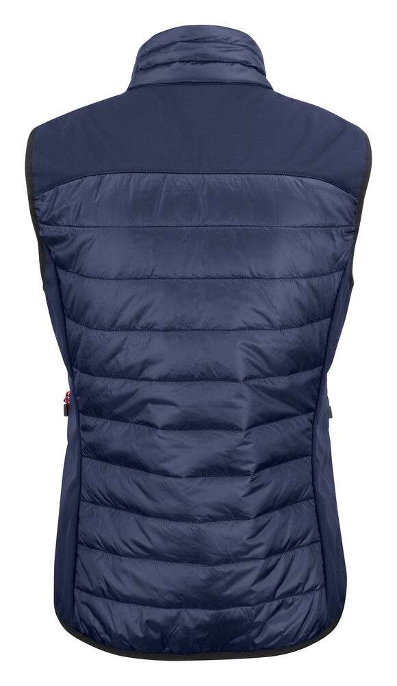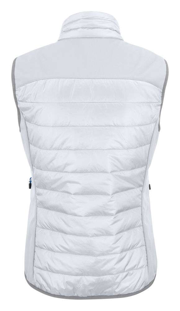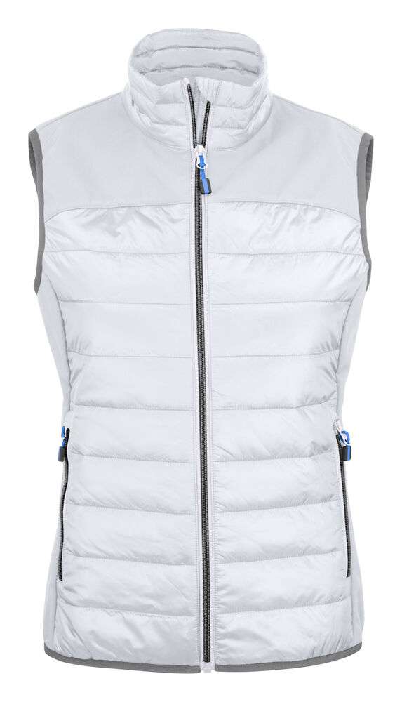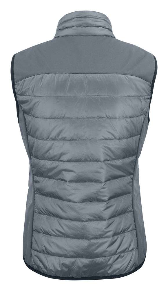 Softshell/ lättviktsväst. Oket, fram & bak, samtsidopaneler av softshell (tyg 1). Bål, fram & bak av vadderat lättviktsmaterial (tyg 2). Blixtlås och zip pullers i Printer Essentials-manér.