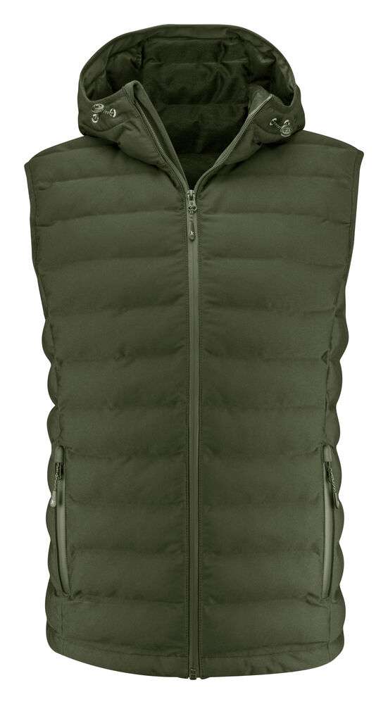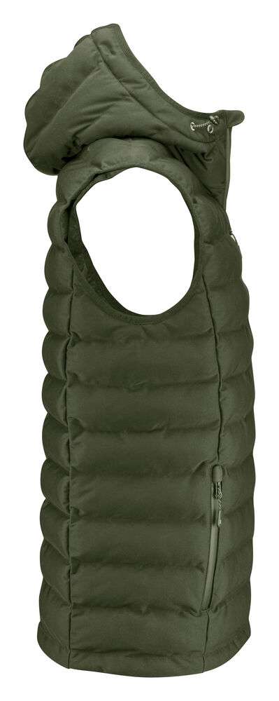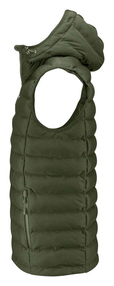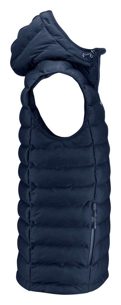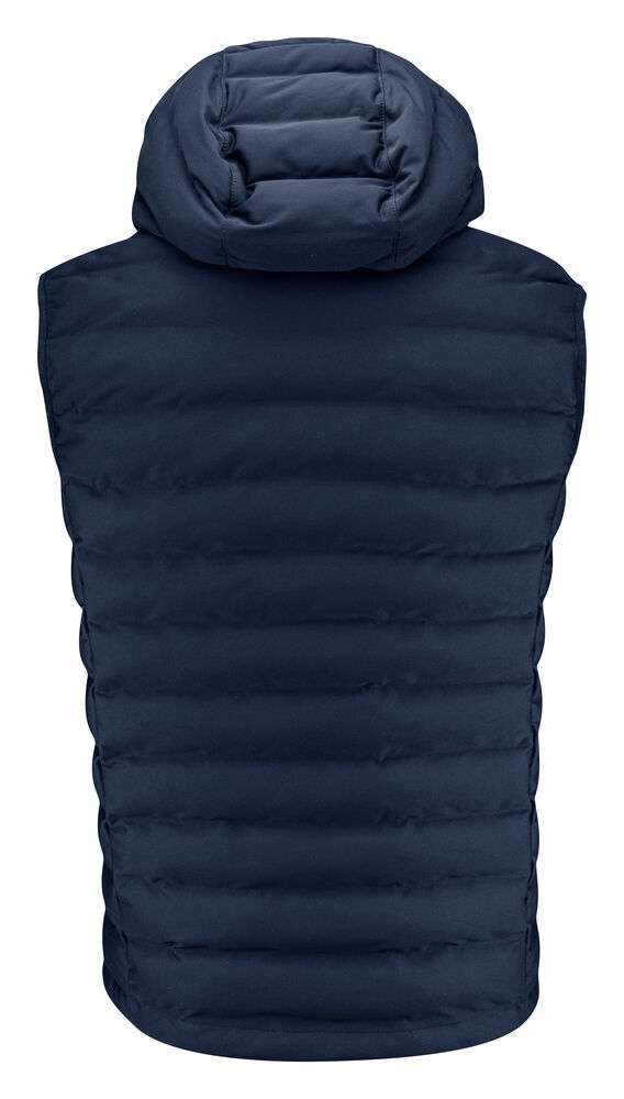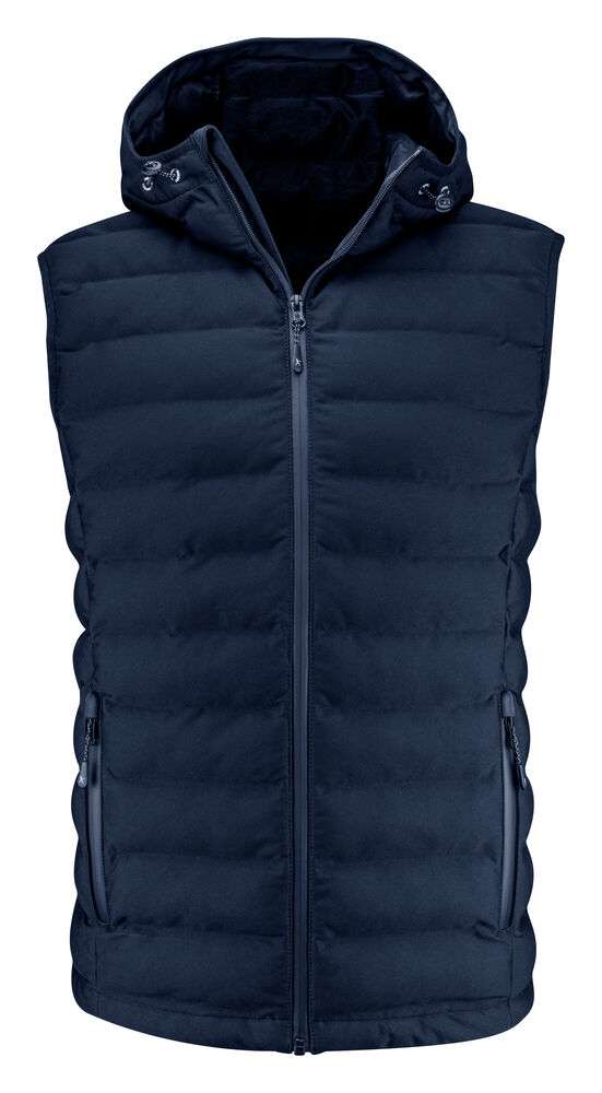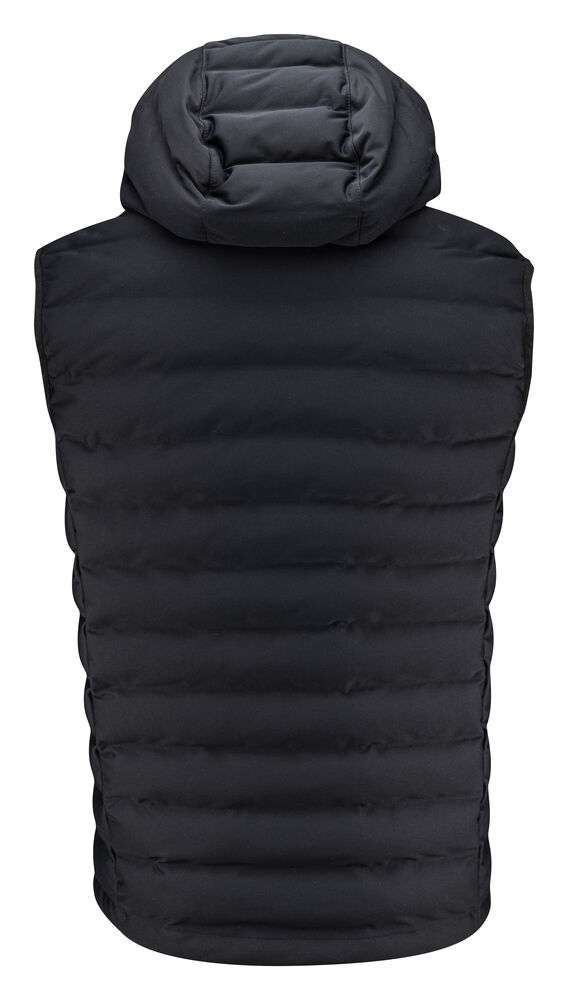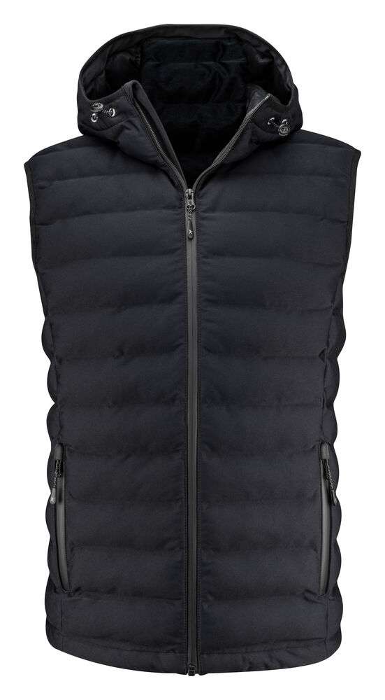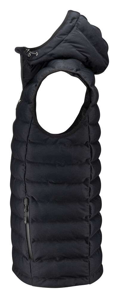 Vadderad väst. Vind- och vattentätt material med andasfunktion. Släta, vattentäta blixtlås fram och i sidfickor. Innerfickor. Justerbar huva med elastiska snören.