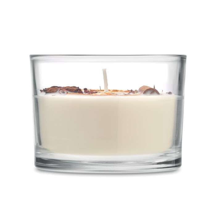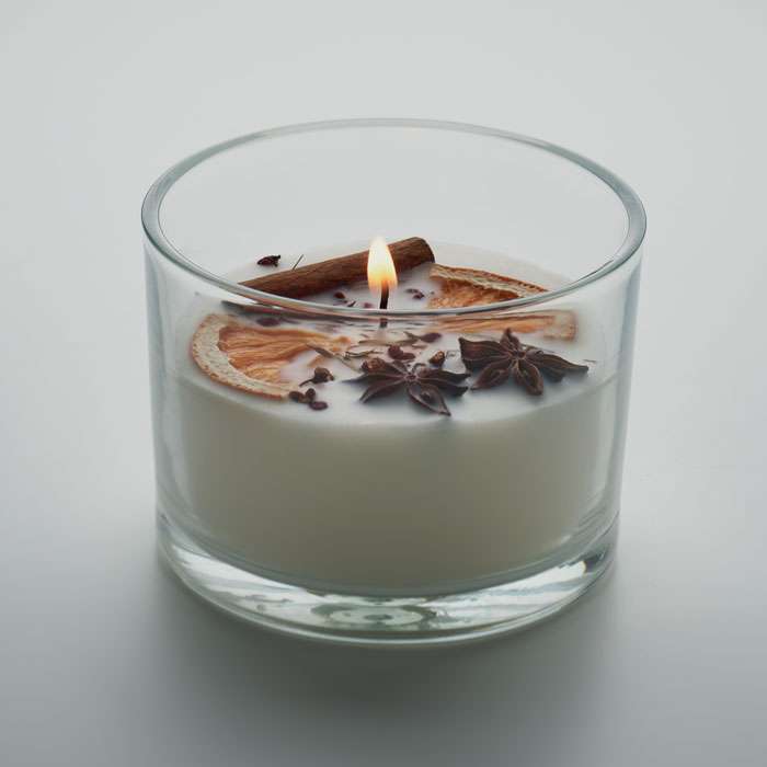 Doftat växtbaserat vaxljus med torkade blommor och frukter i glasburkshållare. Doft kanel & Citrus 300 gr. Brinntid: 50 timmar.