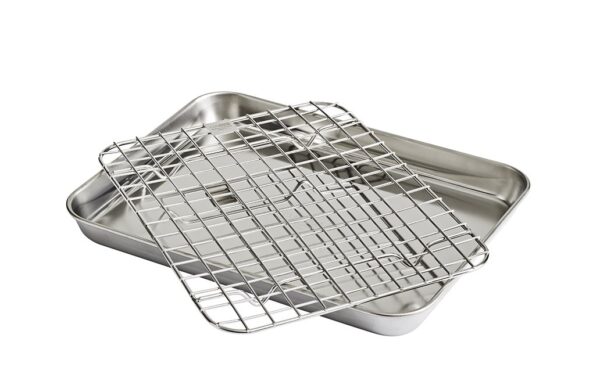 Gastrobleck i rostfritt stål (31,5 x 24,5 x 2,4 cm) med medföljande rutgaller. Gallret kan användas för att vila råvaror eller under tillagning för att lyfta dem från blecket, medan saften samlas upp för såser. Blecket är ugnssäkert, diskmaskinståligt och återfår formen efter användning i hög värme.