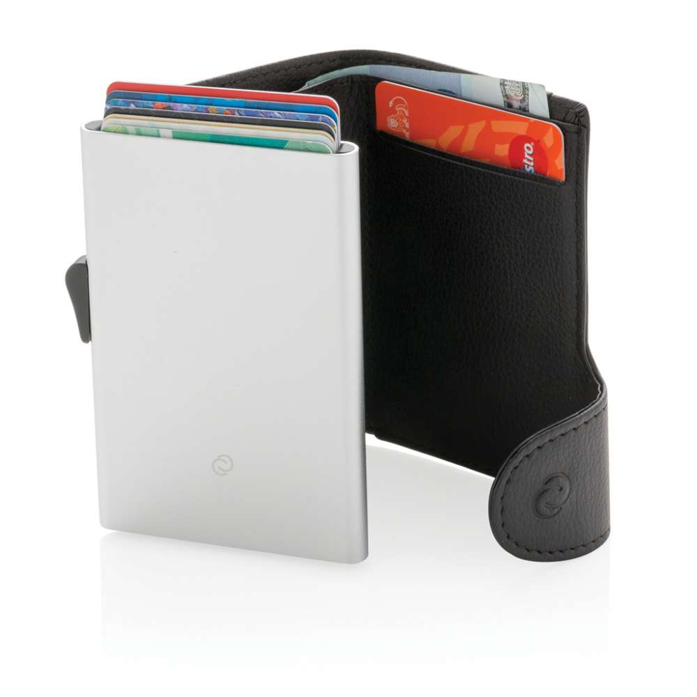 Denna gedigna korthållare i aluminium skyddar dina viktigaste kort mot elektroniska ficktjuvar. Inga mer trasiga eller böjda kort. Plats för upp till 7 kort eller 5 kort med embossing. Reglaget på sidan skjuter gradvis fram korten. I plånboken kan du förvara dina kontanter.