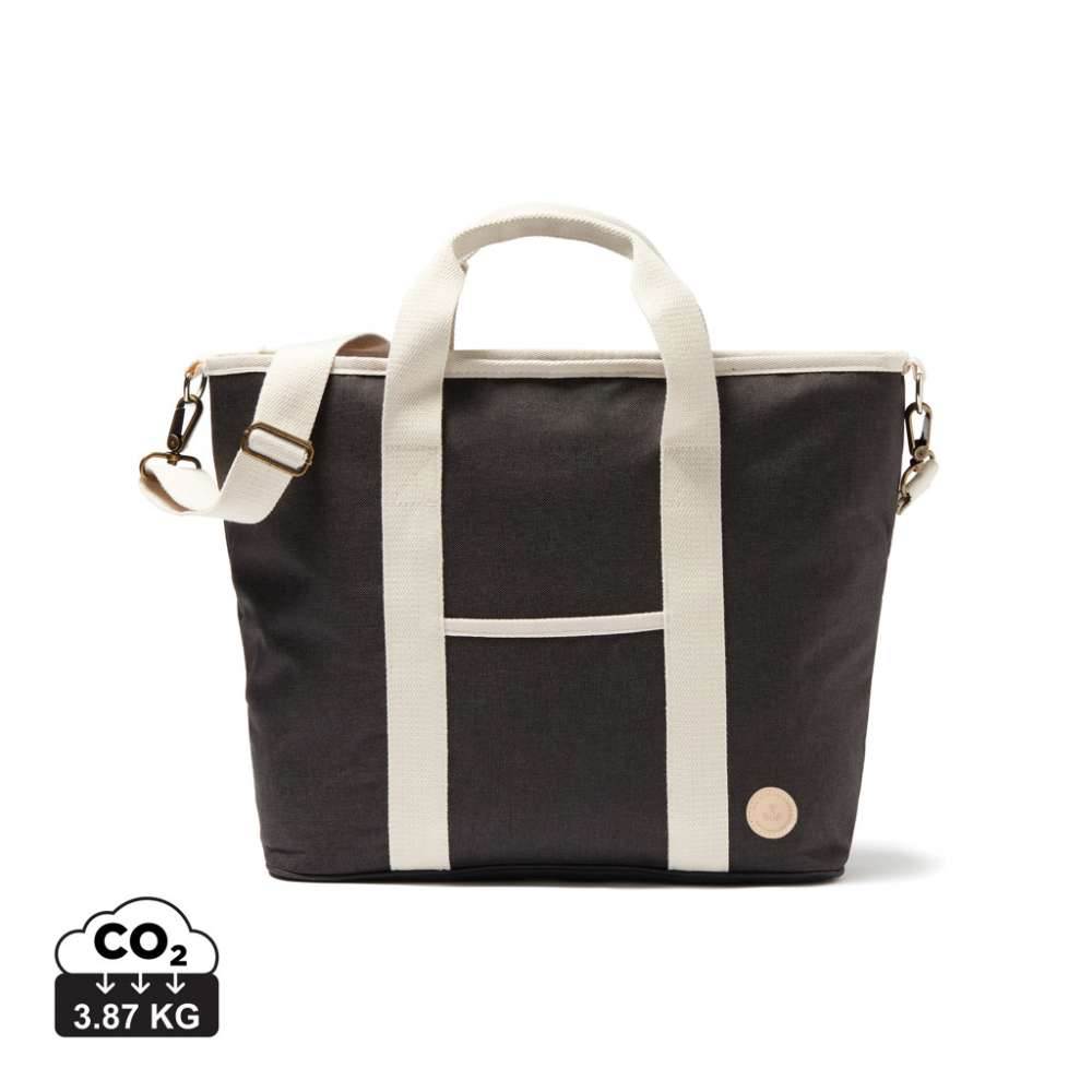 Kylväska som är melerad ton-i-ton och har detaljer i konstläder och bomull, vilket gör den lika snygg som en vanlig väska så du kan picknicka med stil. På utsidan av kylväskan finns även ett mindre fack så du även får plats med andra tillhörigheter. Den tjocka PEVA-vadderingen gör att kylan bevaras länge och den är även enkel att tvätta av och ur efter användning. Med en reglerbar axelrem och dubbla handtag får du flera alternativ att bära kylväskan på.