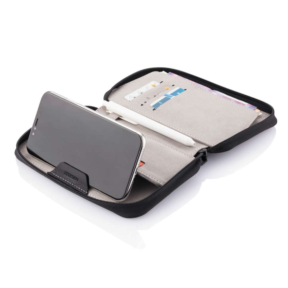 XD Design-passfodral håller dina värdesaker lättillgängliga och skyddade. Förvara ditt pass säkert i den RFID-skyddade fickan och dina boardingkort inom räckhåll i framfickan med magnetstängning. Det speciella med den här passhållaren är att du också kan använda den som telefonställ för att titta på dina favoritfilmer när du är ute och reser. Med 3-i-1-förvaringsutrymmet på insidan kan du också använda den som plånbok och telefonficka. Passar upp till 5,5′ mobiltelefoner.Tillverkad av återvunnet material. Registrerad design®.